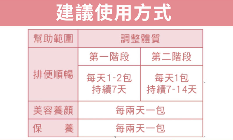 包 裝: 14包入(包裝/每包10公克±3%)保存期限: 三年有效日期: 詳見盒身幫助範圍: 養顏美容、促進排便順暢、幫助消化、幫助維持消化道機能、維持健康、促進新陳代謝食用方法: 每包沖泡約100cc常溫開水即可,或添加於豆漿、果汁飲用(水溫勿超過40度C,飯前空腹使用效果更佳)兒童食用建議: 2-6歲1/4包,12歲以下半包,依個人情況適量調整