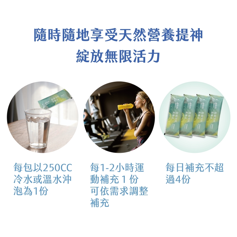 食用方式:每包以250CC冷水或溫水沖泡為1份每1-2小時運動補充1份,可依需求調整補充,每日補充不超過4份