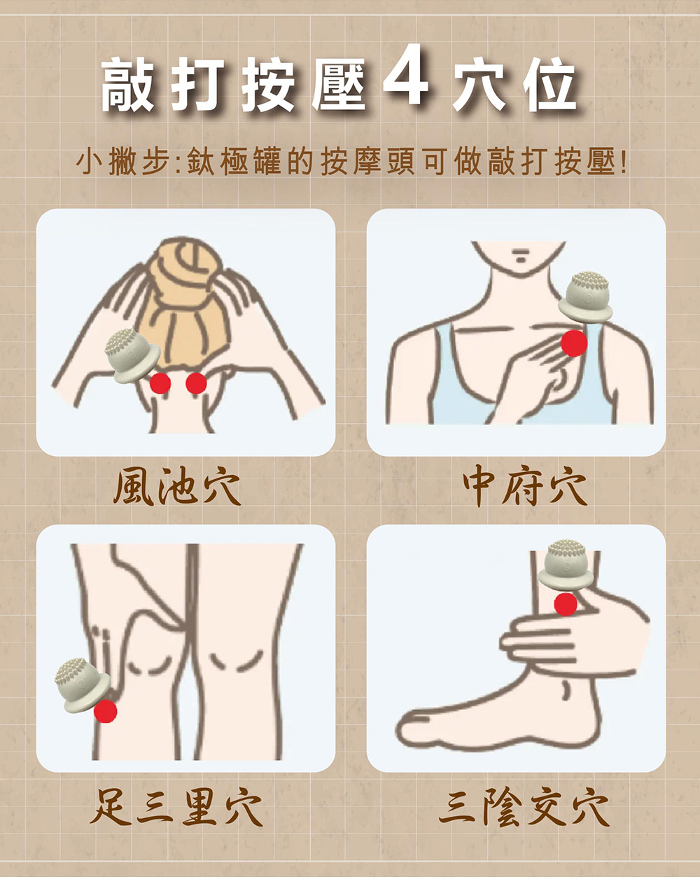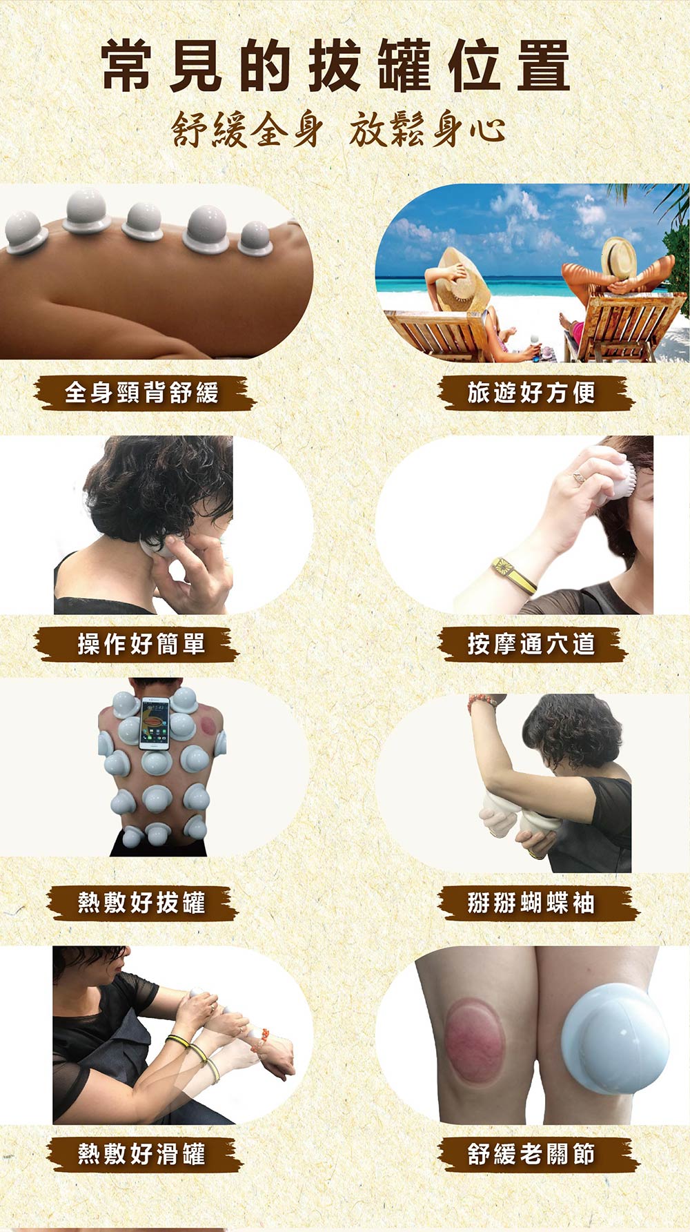 注意事項 :1. 如果吸引部位有傷口、紅腫等異常時請勿使用。2.使用拔罐器於皮膚表面**非常重要**不可超過5分鐘以免造成傷害或水泡等。3.使用過程中,如有不適,應即停用、休息或就醫。4. 對感覺眞空壓力大者請勿使用,請放置兒童不能接觸處。5. 使用後拔罐器上會有水氣屬正常現象。6. 拔罐結束兩小時內不能沖涼,喝冷飮,兩小時後沖涼請用溫熱水。