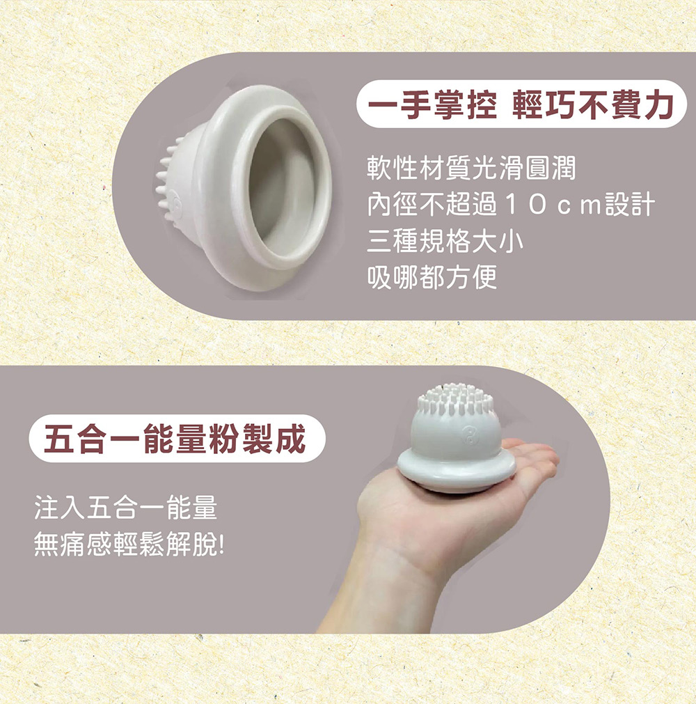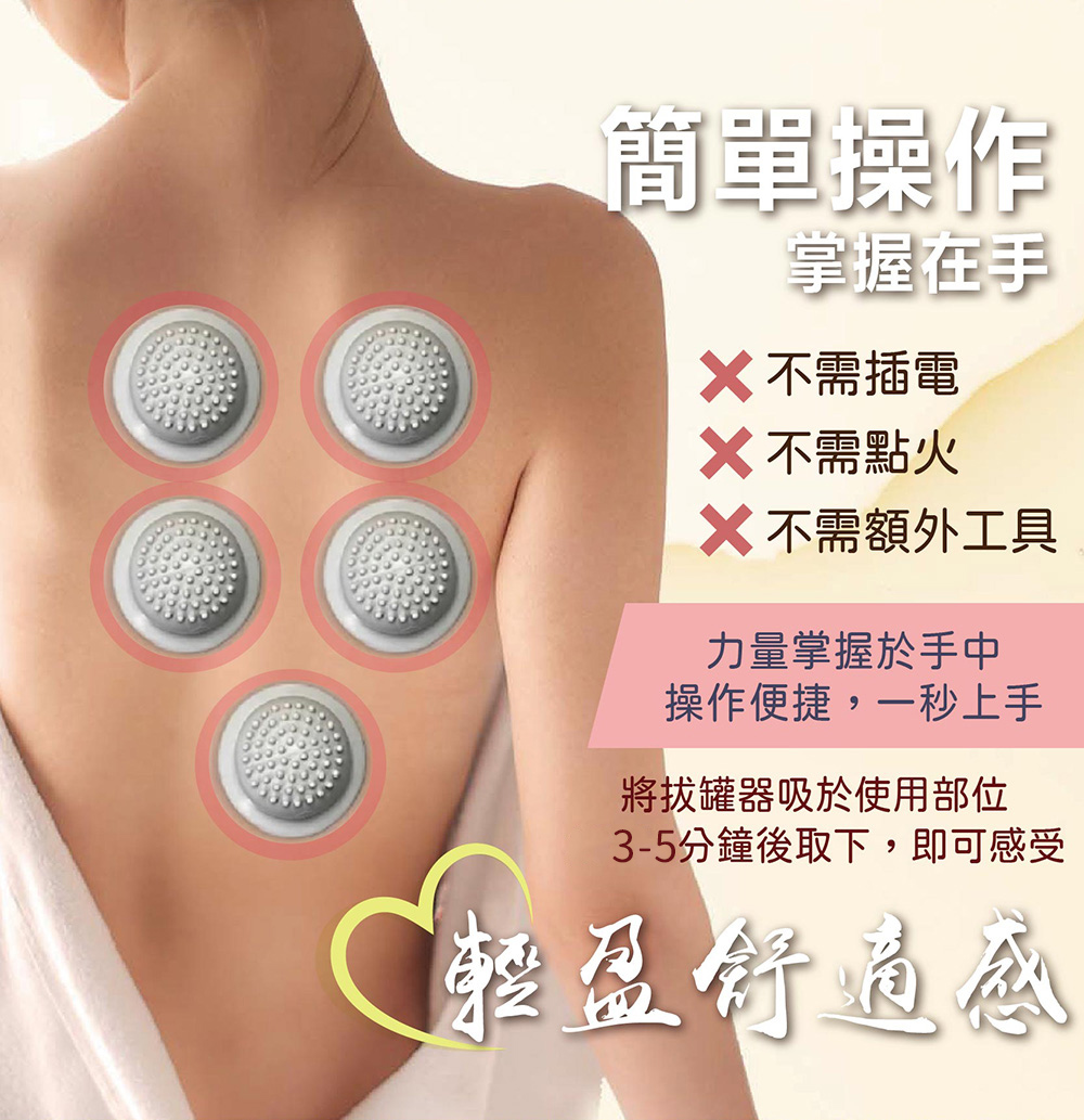 使用說明 :1. 產品使用前,確認矽膠拔罐器是否乾淨淸潔。2. 選擇拔罐部位,將拔罐器按壓於該部位,使用時皮膚若太乾燥,可在表面加上少許精油潤滑。3. 靜待3~5分鐘即可,按壓產品頂部,將空氣排出即可取下。4. 產品使用前請以100度C熱水浸泡10秒,以達到消毒殺菌之目的。