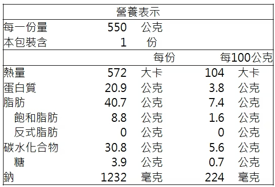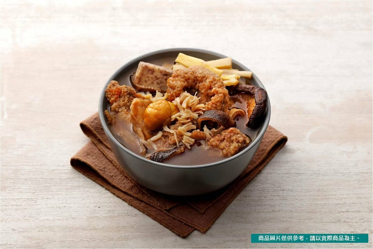 水、雞湯(水、雞骨)、柴魚高湯[水、柴魚片(鰹魚)]、雞肉、豬肉(台灣)、桂竹筍、芋頭、魚皮、豬肚(台灣)、栗子、香菇、干貝、醬油[水、大豆胺基酸液(脫脂大豆片)、食鹽、調味劑(5'-次黃嘌呤核苷磷酸二鈉、5'-鳥嘌呤核苷磷酸二鈉、琥珀酸二鈉)]、醬油、烏醋、米酒、香油(大豆油、芝麻油)、糖、調味劑(L-麩酸鈉、鹽)、白胡椒、地瓜粉