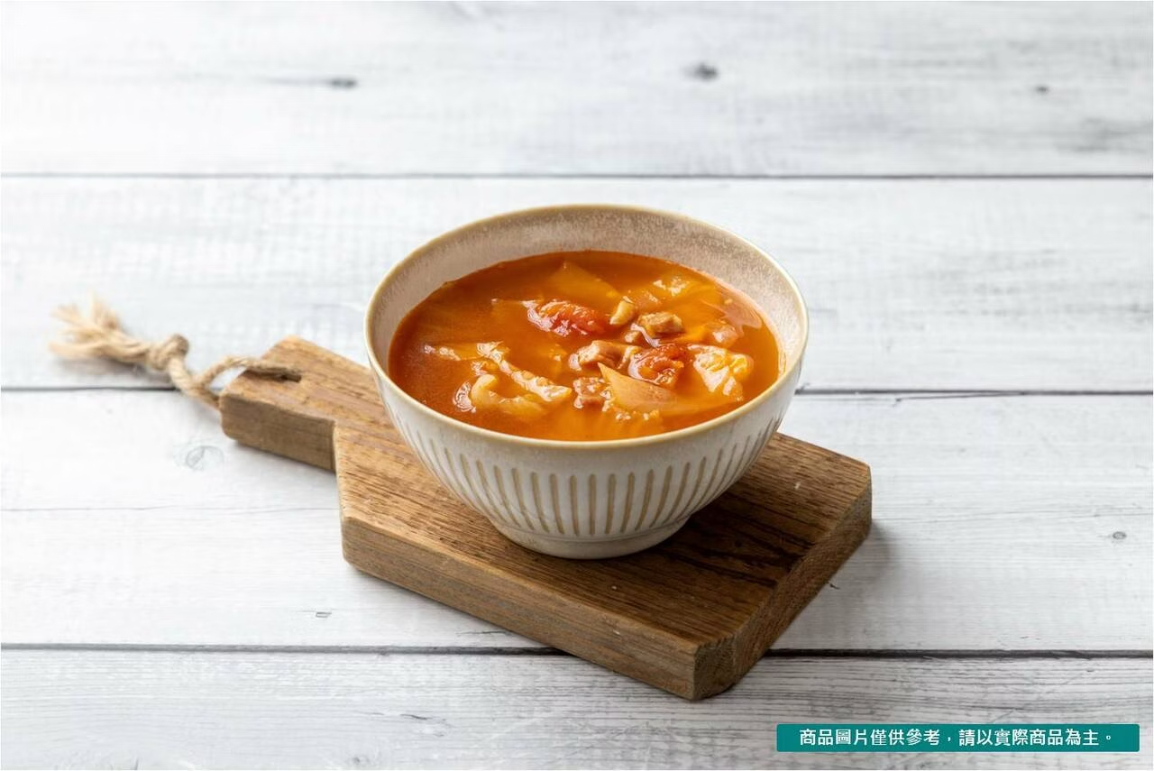 特選番茄、高麗菜、洋蔥等多種新鮮蔬菜,慢火熬煮,再加入白荳蔻、胡椒等香料提味,讓食材的風味完美呈現,是碗營養滿點的湯品。