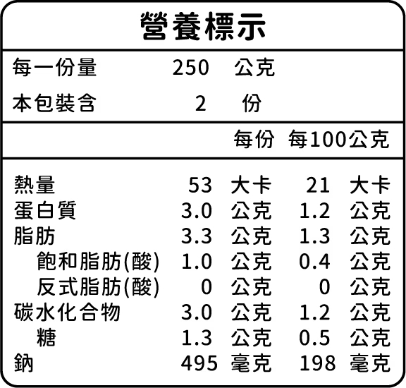 水、蕃茄丁(切碎蕃茄、蕃茄汁、檸檬酸)、高麗菜、洋蔥、培根[豬肉(西班牙、台灣)、水、食鹽、蔗糖、大豆蛋白(非基因改造)、豌豆萃取物、胡蘿蔔萃取物、馬鈴薯澱粉、馬鈴薯纖維、豬皮明膠、磷酸鈉、麥芽糊精、乳清粉、蛋白粉、多磷酸鈉、焦磷酸鈉(無水)、豬血漿蛋白、豬肉蛋白、抗氧化劑(混合濃縮生育醇)、小麥蛋白、檸檬酸鈉、抗氧化劑(異抗壞血酸鈉)、複方調味劑[L-麩酸鈉、琥珀酸二鈉、5'-次黄嘌呤核苷磷酸二鈉、5'-烏嘌呤核苷磷酸二鈉]、香料、L-麩酸鈉、膠原蛋白、複方著色劑[葡萄糖、檸檬酸鈉、乳糖、鉀明礬、碳酸鈉、蟲漆酸]、葡萄糖酸-δ-內酯、亞硝酸鈉、硝酸鉀]、西芹、紅蘿蔔、蕃茄糊[番茄泥(蕃茄糊、水)、檸檬酸]、大豆油、雞粉[鹽、麥芽糊精、L-麩酸鈉、糖、玉米澱粉、雞肉粉、香料、酵母萃取物(酵母萃取物、鹽)、雞油、棕櫚油(棕櫚油、硬質棕櫚油)、調味劑(5'-次黃嘌呤核苷磷酸二鈉、5 '-鳥嘌呤核苷磷酸二鈉)、白胡椒]、大蒜、大骨粉[鹽、調味劑(L-麩酸鈉、胺基乙酸、琥珀酸二鈉、5'-次黃嘌呤核苷磷酸二鈉、5'-鳥嘌呤核苷磷酸二鈉)、麥芽糊精、糖、豬肉粉(乳糖、醬油粉、植物水解蛋白(大豆、玉米、小麥)、DL-胺基丙酸、精製芥花油、豬肉抽出物、葡萄糖、D-木糖)、洋蔥粉、品質改良劑(二氧化矽)、香料、甘草、薑母、當歸(調味用)、白胡椒]、鹽、胡椒
