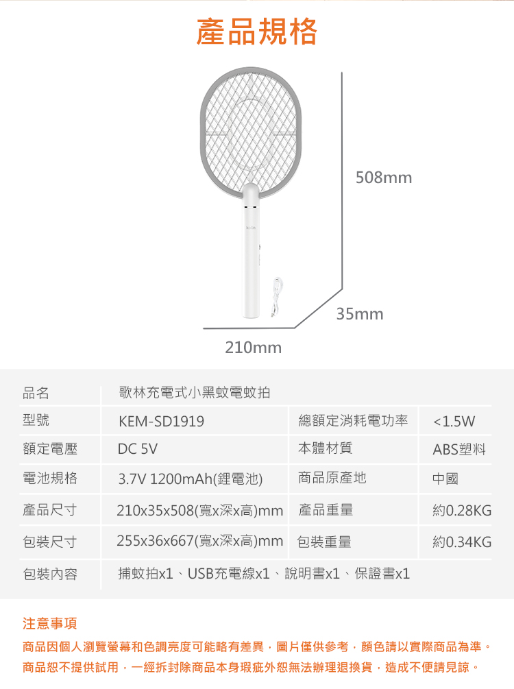 歌林充電式小黑蚊電蚊拍(鋰電池)KEM-SD1919