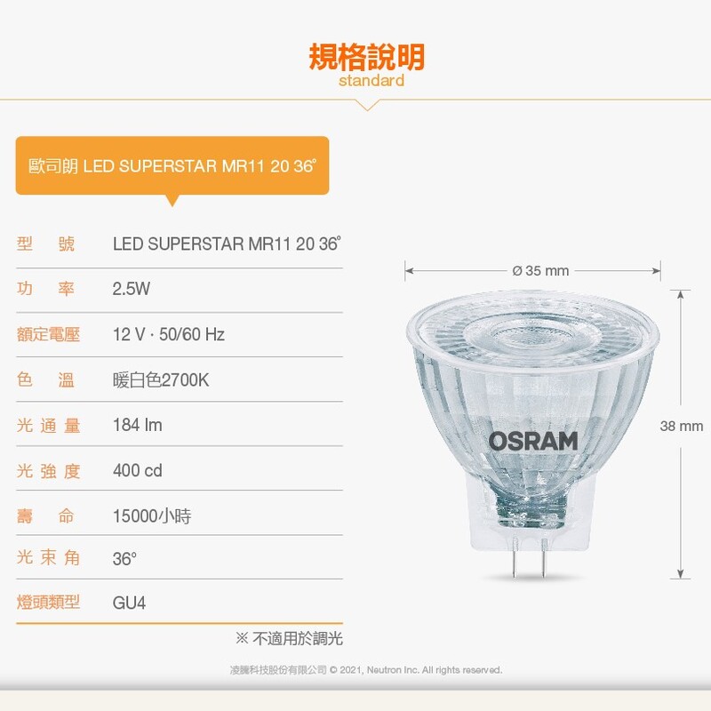 2.5W/184lm/壽命15000小時/燈頭GU4/光束角36度/歐司朗杯燈MR11