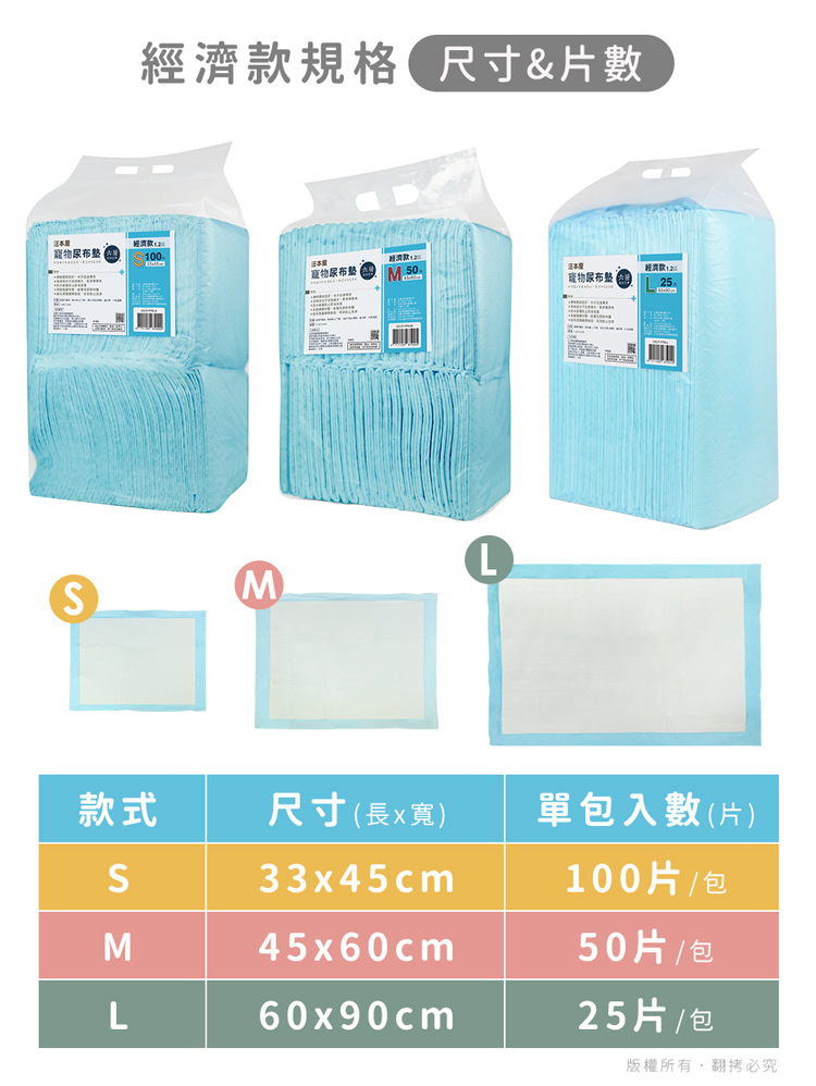 汪本屋 實用經濟款 寵物尿布墊(S號/M號/L號)-6包 --六層鎖水技術,加倍鎖水乾爽無異味----無添加色素香料,狗/貓/鼠/兔…等皆適用-- 專為毛孩所設計的衛生用品,如海綿般吸水,尿液迅速導流,輕鬆潔淨每一天,強效鎖水防止尿液側漏,保持整潔乾淨 用途廣泛,除了可放於寵物籠底部,或雙層貓砂盆下層吸水之外,如果需要帶寵物外出時,也可置於寵物推車、外出籠、外出包…等擺放尿布墊於底部,可保持空間整潔! 六層鎖水技術,上層親膚不織布,給毛孩柔軟呵護,網格壓紋設計,搭配雙層吸水紙,水分迅速導流高分子吸水顆粒,瞬吸自身體積數倍重量水分,加倍鎖水絨毛漿層瞬間吸收,有效防止回滲,底部PE防水膜徹底杜絕液體滲漏! S號(33x45cm):幼犬/倉鼠籠/兔籠/外出包…等M號(45x60cm):中型犬/貓砂盆門口/雙層貓砂盆底層…等L號(60x90cm):大型犬/術後保潔墊/汽車踏墊…等 <圖> 使用方式: 1.購買前,請先選擇適合寵物體型與擺放場所的尺寸 S號(33x45cm):幼犬/小型犬/倉鼠籠/兔籠/外出包…等 M號(45x60cm):中型犬/貓砂盆門口/雙層砂盆底層…等 L號(60x90cm):大型犬/術後保潔墊/汽車踏墊…等2.打開包裝後取出尿布墊,將不織布面朝上擺放。3.平鋪在平坦面或是寵物籠尿盆上即可開始使用。 如何訓練定點如廁: 1.請選擇能讓寵物安心及安撫的地點與空間,如廁所、寵物籠…等 在地點決定後,請勿隨意更換地點,免以造成寵物認知誤差!2.初始訓練時,當狗狗有想大/小便的徵兆時(到處嗅、轉圈圈、臂部蹲低…), 請立刻帶寵物至尿布墊擺放的場所。3.再訓練的過程中,請飼主給與耐心/讚美/獎勵,重覆動作是教育很重要的一環。 切勿以處罰的方式來進行訓練,否則可能造成寵物身、心受傷。4.狗狗上過幾次後,之後就會習慣去尿布墊上尿尿。5.在訓練過程中寵物如果至錯誤的地點大/小便,請確實清掃乾淨,切勿留下臭味。6.可搭配圍籬、誘導劑、禁區噴霧…等,幫助訓練過程順利。 注意事項: .本產品僅供寵物使用。.本商品為接觸型商品,為避免傳染性疾病(如:跳蚤/壁虱/疥癬…等) 一經開封或試用過,恕不受理更換事宜。.若尿布墊已被寵物拉扯斷裂時,請立即終止使用。.使用時請將不織布面朝上做用。.請勿將尿布墊丟入馬桶中,這將會導致排水管的堵塞。.購買前仔細詳閱商品規格尺寸,慎重購買,以免造成日後買賣糾紛。.尺寸與重量皆採手工測量,±5%誤差屬正常範圍。 轉載警示: 自民國108年6月1日起(含追溯既往),鈞嵐(立嵐)企業有限公司之 商品圖片、影片或鈞嵐(立嵐)企業有限公司文字及LOGO, 任何客戶或用戶需轉載刊登任何圖片、文字、影片 皆需經過鈞嵐(立嵐)書面同意,如有需求請與鈞嵐(立嵐)客服中心接洽聯絡。 若任何未經鈞嵐(立嵐)同意即任意轉載刊登者, 我司將進行相關智慧財產著作權與商標權及商業法的追訴權利。 商品規格: .型 號:OO-P-PPA-BOX.品 名:汪本屋 實用經濟款 寵物尿布墊.規 格:S號 33x45cm/片;M號 45x60cm/片;L號 60x90cm/片.單包入數:S號 100片/包;M號 50片/包;L號 25片/包.重 量:約 1200 g ±5% (單包).材 質:親膚不織布、吸水紙(上下層)、高分子吸水顆粒、絨毛漿、PE防漏膜.包裝內含:S號 100片/包,共6包 M號 50片/包,共6包 L號 25片/包,共6包.商品保固:僅限新品瑕疪更可換商品