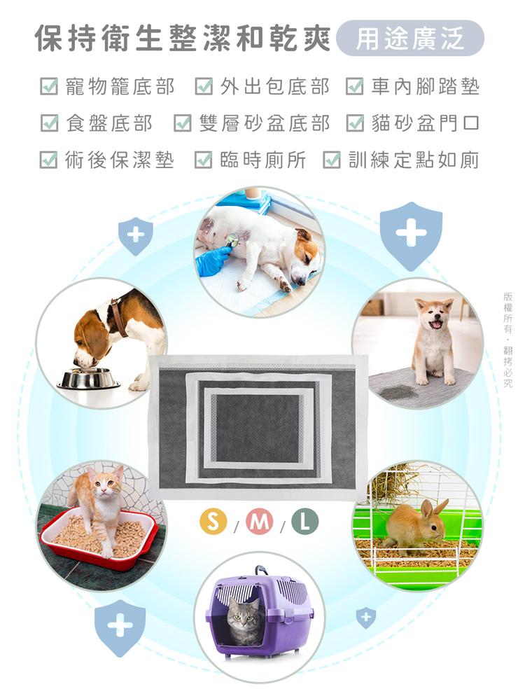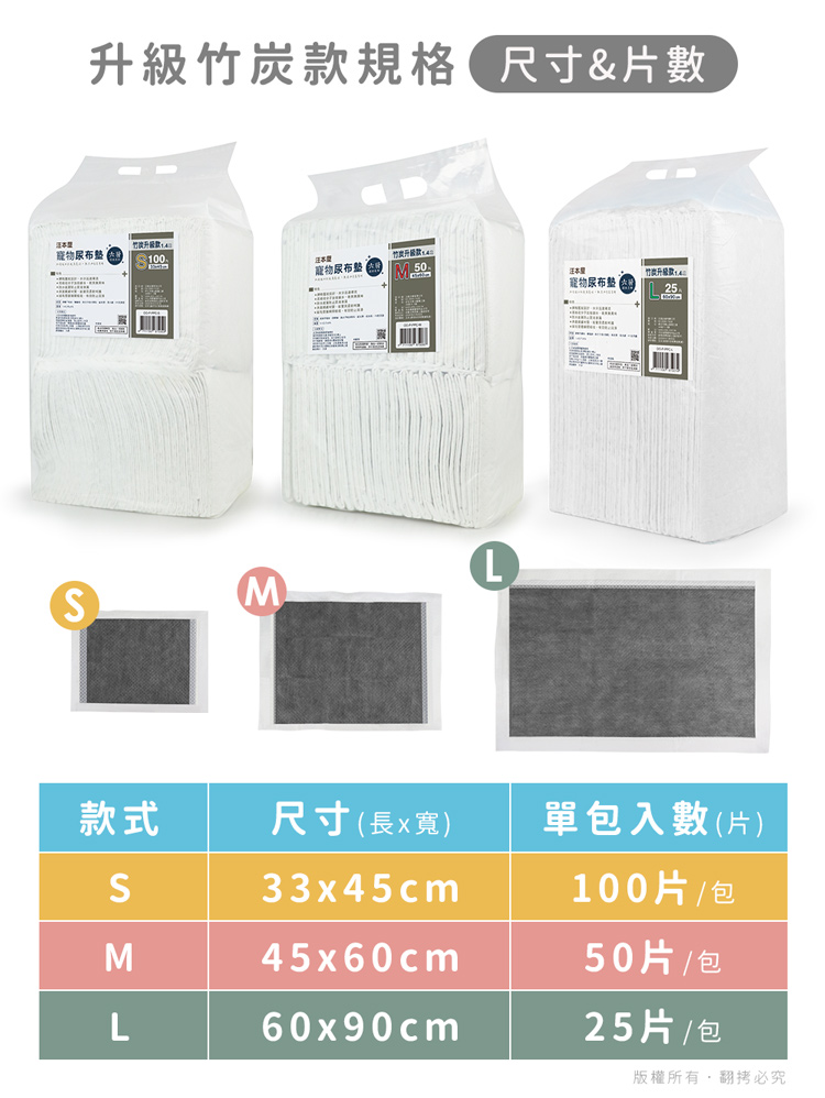 汪本屋 竹炭升級款 寵物尿布墊(S號/M號/L號)-6包 --六層鎖水技術,加倍鎖水乾爽無異味----無添加色素香料,狗/貓/鼠/兔…等皆適用-- 專為毛孩所設計的衛生用品,如海綿般吸水,尿液迅速導流,輕鬆潔淨每一天,強效鎖水防止尿液側漏,保持整潔乾淨 用途廣泛,除了可放於寵物籠底部,或雙層貓砂盆下層吸水之外,如果需要帶寵物外出時,也可置於寵物推車、外出籠、外出包…等擺放尿布墊於底部,可保持空間整潔! 六層鎖水技術,上層親膚不織布,給毛孩柔軟呵護,網格壓紋設計,水分迅速導流,除臭竹炭纖維層,有效吸附異味高分子吸水顆粒,瞬吸自身體積數倍重量水分,加倍鎖水加厚絨毛漿層瞬間吸收,有效防止回滲,底部PE防水膜徹底杜絕液體滲漏! S號(33x45cm):幼犬/倉鼠籠/兔籠/外出包…等M號(45x60cm):中型犬/貓砂盆門口/雙層貓砂盆底層…等L號(60x90cm):大型犬/術後保潔墊/汽車踏墊…等 使用方式: 1.購買前,請先選擇適合寵物體型與擺放場所的尺寸 S號(33x45cm):幼犬/小型犬/倉鼠籠/兔籠/外出包…等 M號(45x60cm):中型犬/貓砂盆門口/雙層砂盆底層…等 L號(60x90cm):大型犬/術後保潔墊/汽車踏墊…等2.打開包裝後取出尿布墊,將不織布面朝上擺放。3.平鋪在平坦面或是寵物籠尿盆上即可開始使用。 如何訓練定點如廁: 1.請選擇能讓寵物安心及安撫的地點與空間,如廁所、寵物籠…等 在地點決定後,請勿隨意更換地點,免以造成寵物認知誤差!2.初始訓練時,當狗狗有想大/小便的徵兆時(轉圈圈、臂部蹲低…), 請立刻帶寵物至尿布墊擺放的場所。3.再訓練的過程中,請飼主給與耐心/讚美/獎勵,重覆動作是教育很重要的一環。 切勿以處罰的方式來進行訓練,否則可能造成寵物身、心受傷。4.狗狗上過幾次後,之後就會習慣去尿布墊上尿尿。5.在訓練過程中寵物如果至錯誤的地點大/小便,請確實清掃乾淨,切勿留下臭味。6.可搭配圍籬、誘導劑、禁區噴霧…等,幫助訓練過程順利。 注意事項: .本產品僅供寵物使用。.本商品為接觸型商品,為避免傳染性疾病(如:跳蚤/壁虱/疥癬…等) 一經開封或試用過,恕不受理更換事宜。.若尿布墊已被寵物拉扯斷裂時,請立即終止使用。.使用時請將不織布面朝上做用。.請勿將尿布墊丟入馬桶中,這將會導致排水管的堵塞。.購買前仔細詳閱商品規格尺寸,慎重購買,以免造成日後買賣糾紛。.尺寸與重量皆採手工測量,±5%誤差屬正常範圍。 轉載警示: 自民國108年6月1日起(含追溯既往),鈞嵐(立嵐)企業有限公司之 商品圖片、影片或鈞嵐(立嵐)企業有限公司文字及LOGO, 任何客戶或用戶需轉載刊登任何圖片、文字、影片 皆需經過鈞嵐(立嵐)書面同意,如有需求請與鈞嵐(立嵐)客服中心接洽聯絡。 若任何未經鈞嵐(立嵐)同意即任意轉載刊登者, 我司將進行相關智慧財產著作權與商標權及商業法的追訴權利。 商品規格: .型 號:OO-P-PPC-BOX.品 名:汪本屋 竹炭升級款 寵物尿布墊.規 格:S號 33x45cm/片;M號 45x60cm/片;L號 60x90cm/片.單包入數:S號 100片/包;M號 50片/包;L號 25片/包.重 量:約 1400 g ±5% (單包).材 質:親膚不織布、竹炭纖維、高分子吸水顆粒、絨毛漿、吸水紙、PE防漏膜.包裝內含:S號 100片/包,共6包 M號 50片/包,共6包 L號 25片/包,共6包.商品保固:僅限新品瑕疪更可換商品
