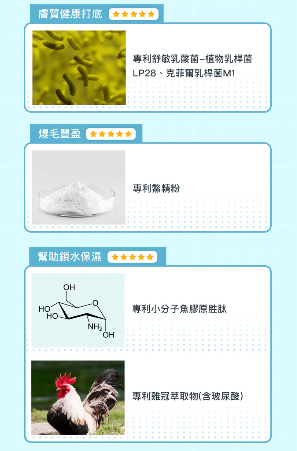 CinterPlex®綜合維生素(含鐵、含鋅)、Cinteral®專利微生肽、專利鱉精粉、專利舒敏乳酸菌(植物乳桿菌LP28、克菲爾乳桿菌M1)、專利小分子魚膠原胜肽、專利蛋殼膜粉萃取物(含彈力蛋白)、日本米賽洛美萃取物(神經醯胺)、專利雞冠萃取物(含玻尿酸) 、深海魚粉