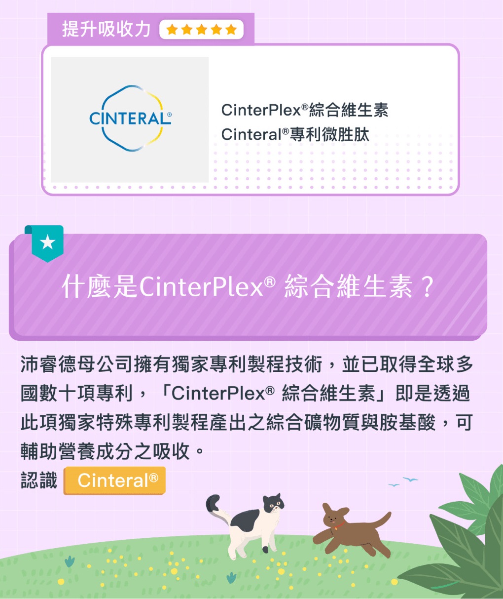 CinterPlex®綜合維生素(含鐵)、Cinteral®專利微胜肽、植物乳桿菌LP28、克菲爾乳桿菌M1、專利綜合蔬果酵素、菊糖、深海魚粉