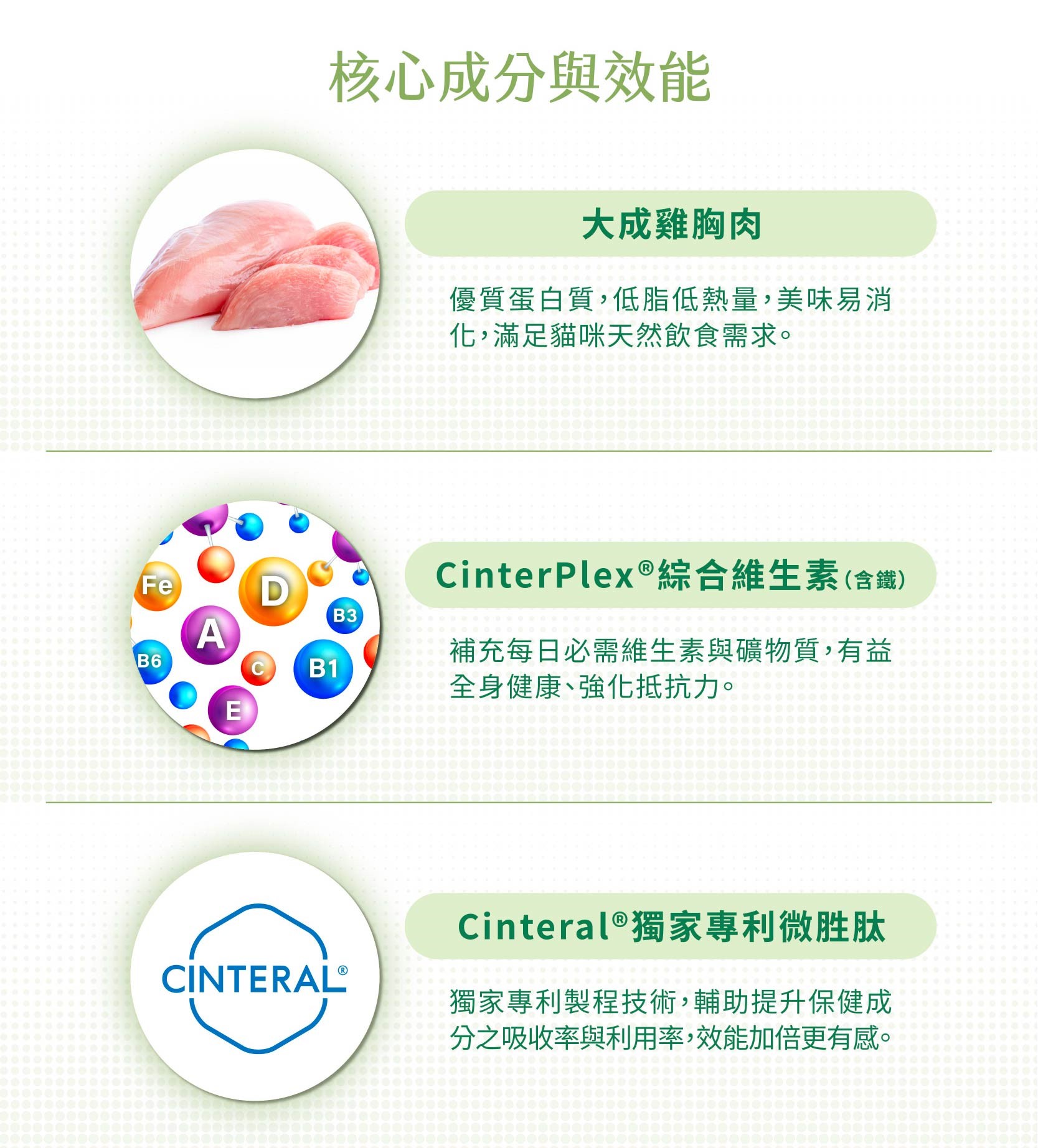 雞肉、CinterPlex®綜合維生素(含鐵)、Cinteral®專利微胜肽、天然綠藻、植物乳桿菌LP28、克菲爾乳桿菌M1、專利綜合蔬果酵素、菊糖