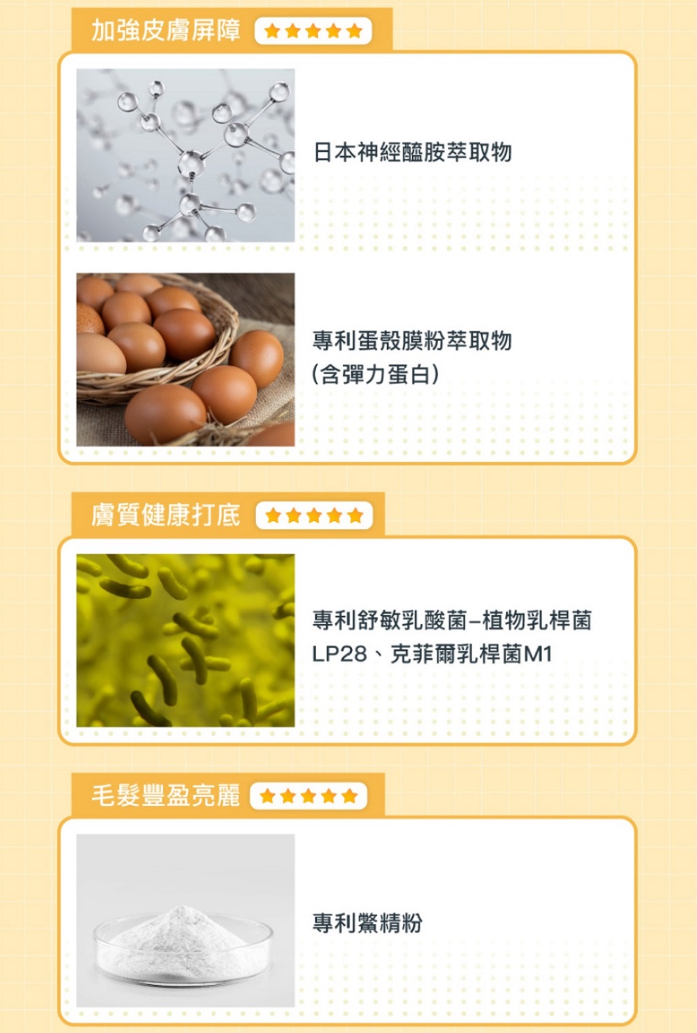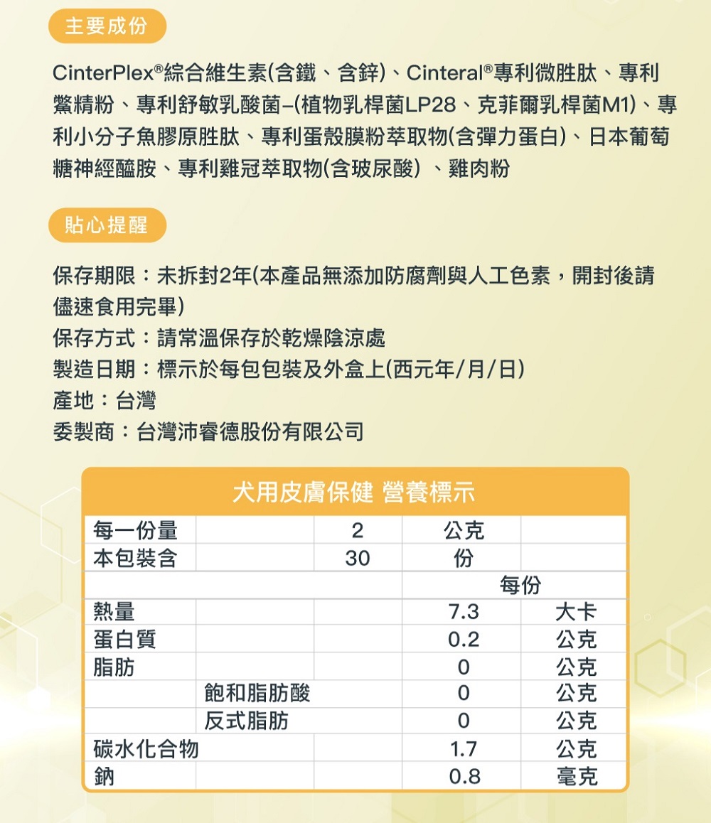 CinterPlex®綜合維生素(含鐵、含鋅)、Cinteral®專利微生肽、專利鱉精粉、專利舒敏乳酸菌(植物乳桿菌LP28、克菲爾乳桿菌M1)、專利小分子魚膠原胜肽、專利蛋殼膜粉萃取物(含彈力蛋白)、日本米賽洛美萃取物(神經醯胺)、專利雞冠萃取物(含玻尿酸) 、雞肉粉