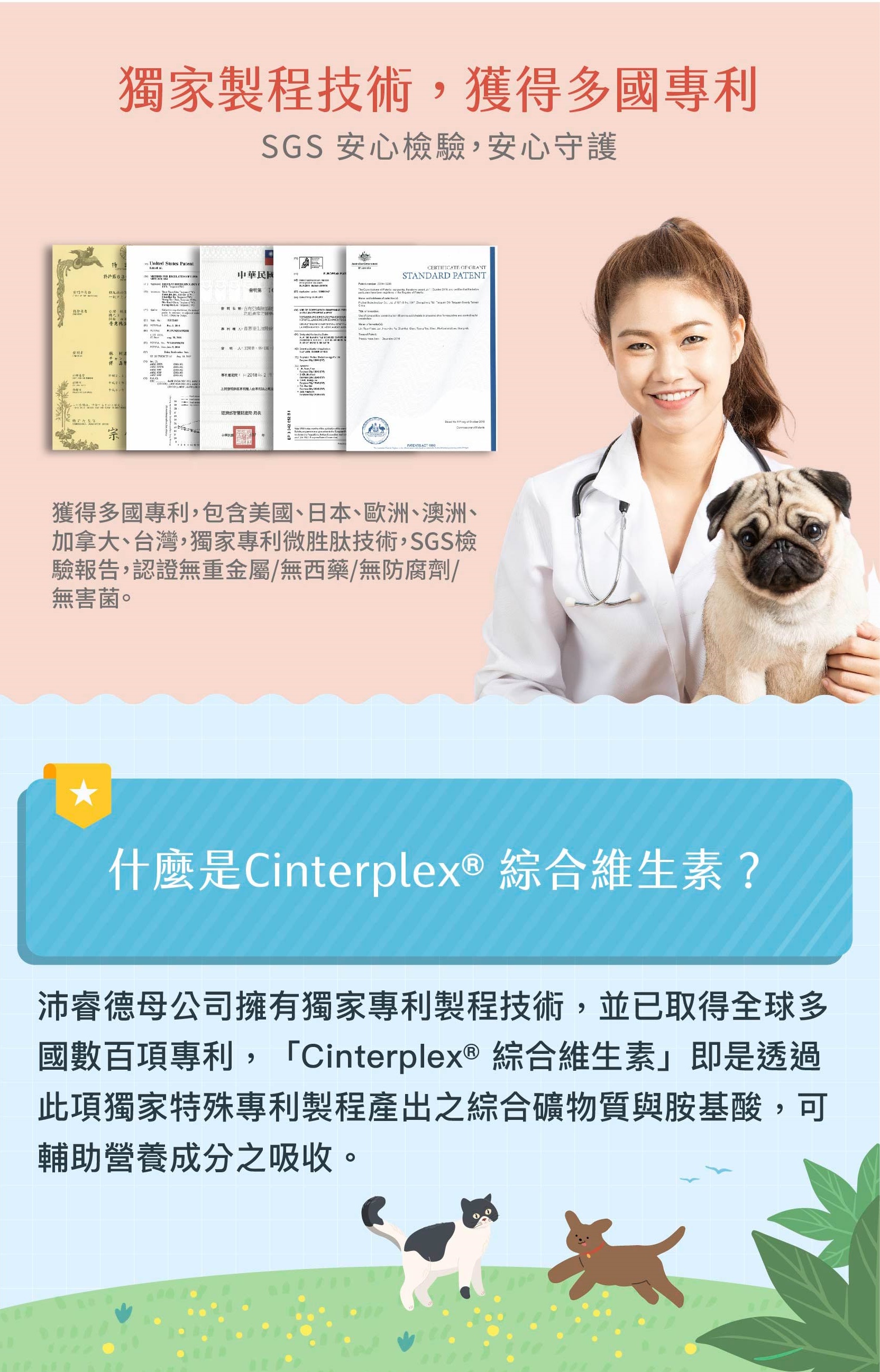 CinterPlex®綜合維生素(含鐵)、Cinteral®專利微生肽、植物乳桿菌LP28、克菲爾乳桿菌M1、專利綜合蔬果酵素、菊糖、雞肉粉