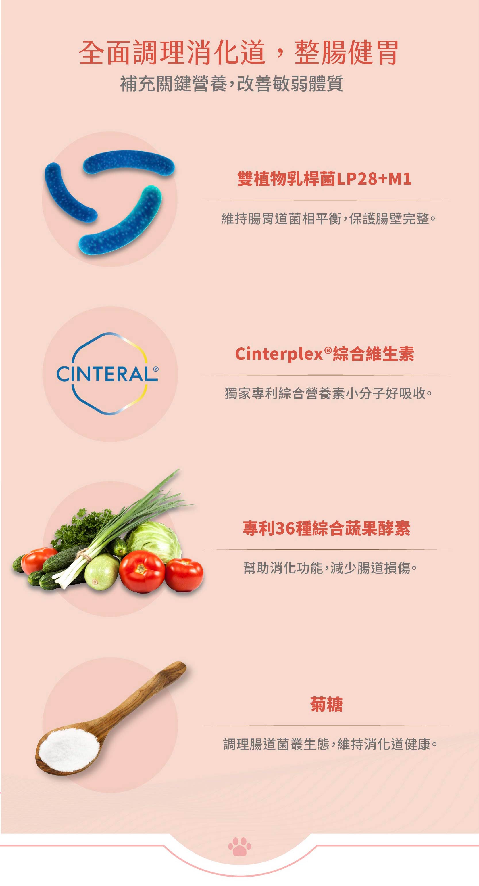 雞肉、Cinteral®專利微生肽、CinterPlex®綜合維生素(Vit C、Vit B3、Vit B6、Vit B1、Vit D、Vit A、Vit E)、植物乳桿菌LP28、克菲爾乳桿菌M1、專利綜合蔬果酵素濃縮粉、菊糖、山梨糖醇、小麥蛋白、葡萄柚籽萃取物、Methionine、Lysine、Glycine、Fe、Folic Acid