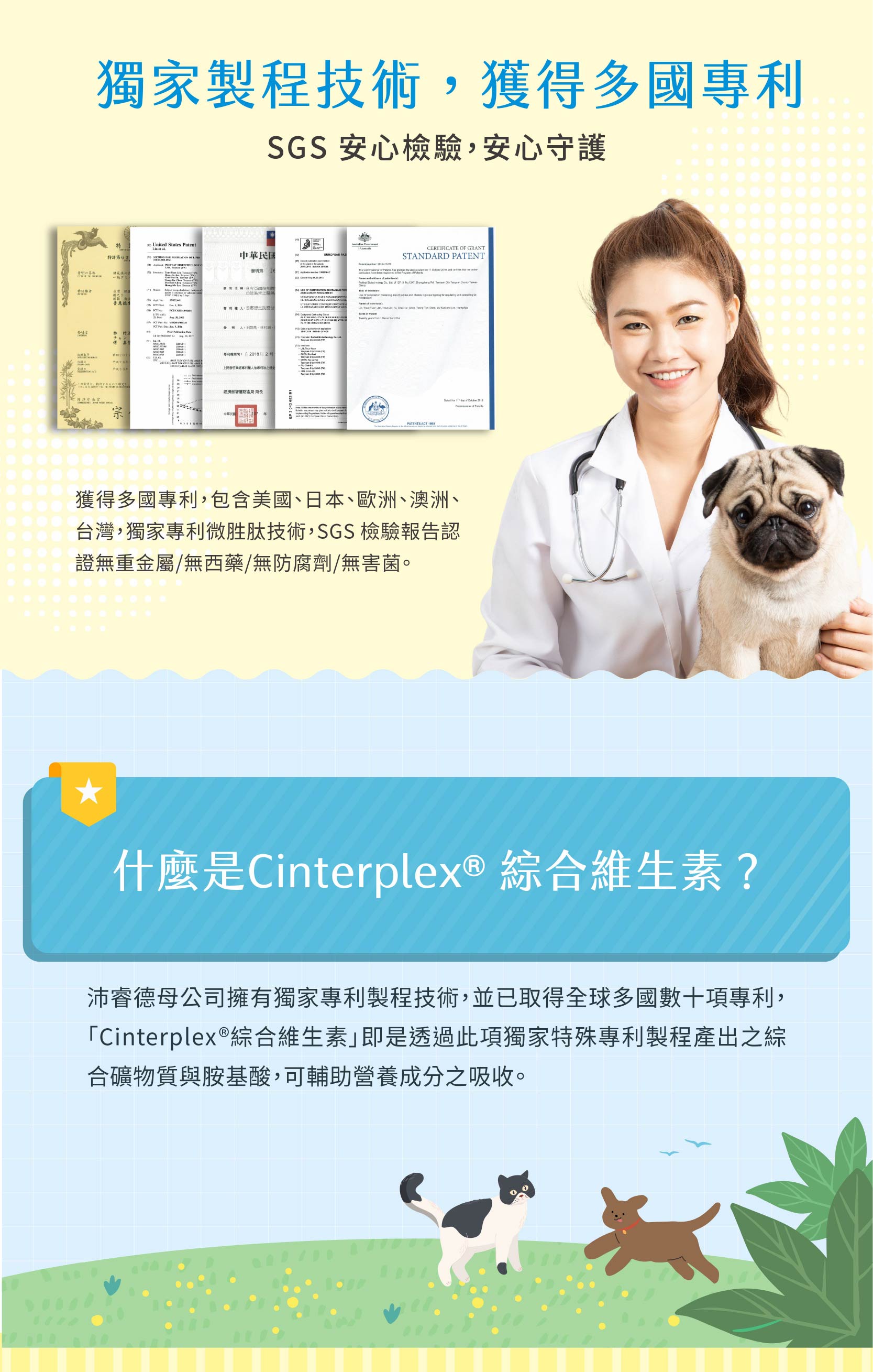 CinterPlex®綜合維生素、Cinteral®專利微胜肽、洋車前子粉、N.zimes® 專利基礎綜合消化酵素、Fibersol®-2專利可溶性纖維、卵磷脂粉、綠藻粉、亞麻籽粉