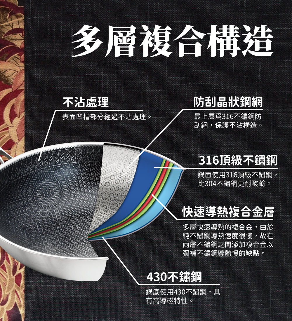 ◆鍋身材質:內層採用316不鏽鋼,不沾塗層,外層採用430導磁性不鏽鋼。