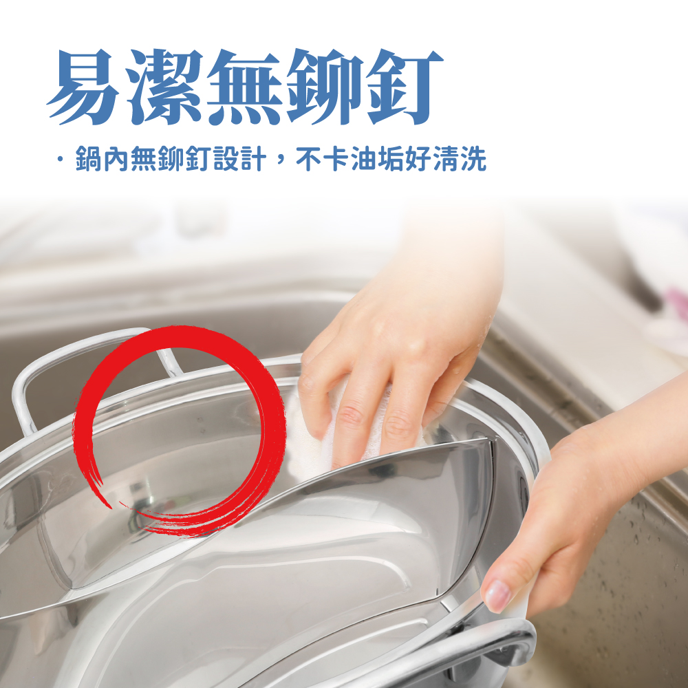 ※鍋內無鉚釘設計,不卡油垢好清洗。