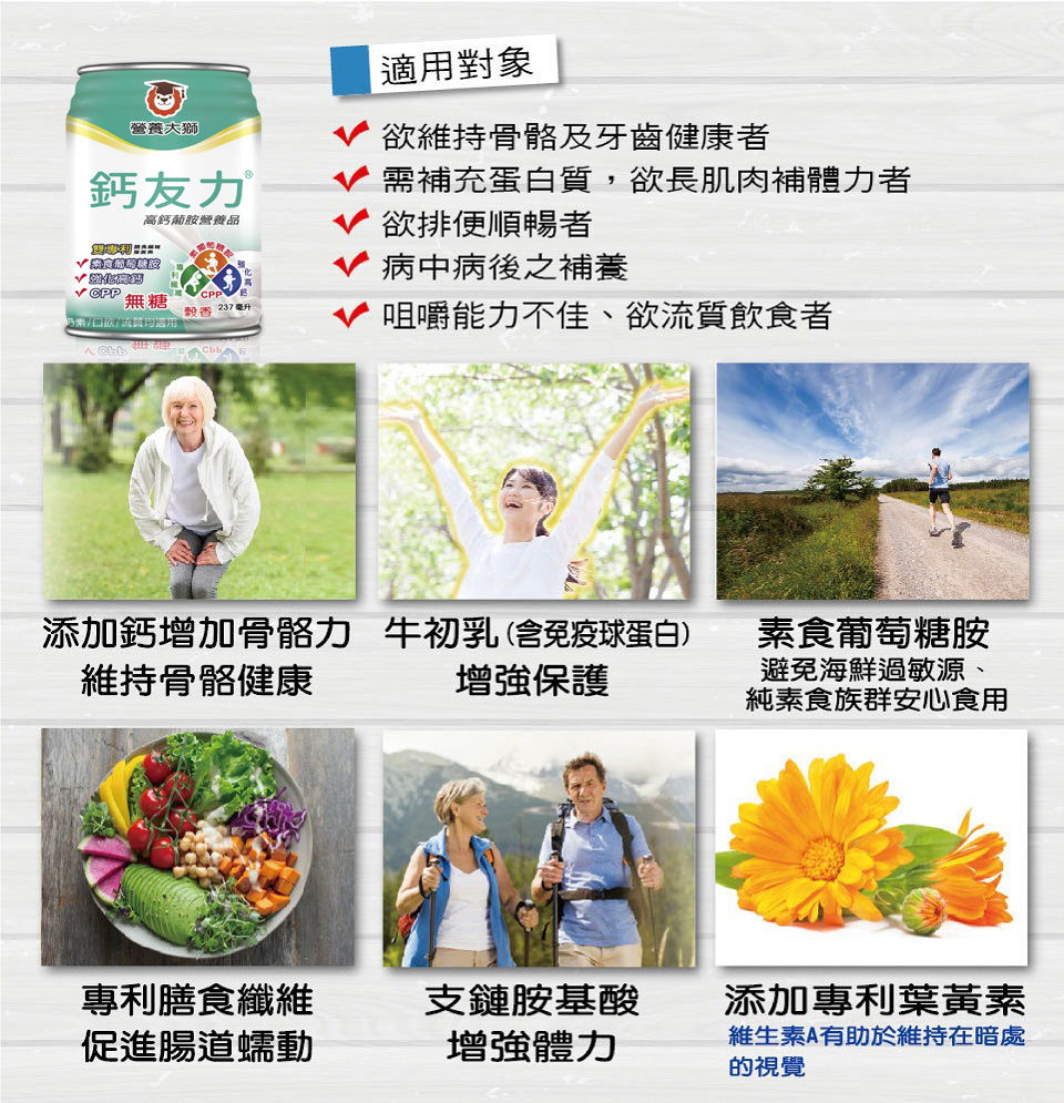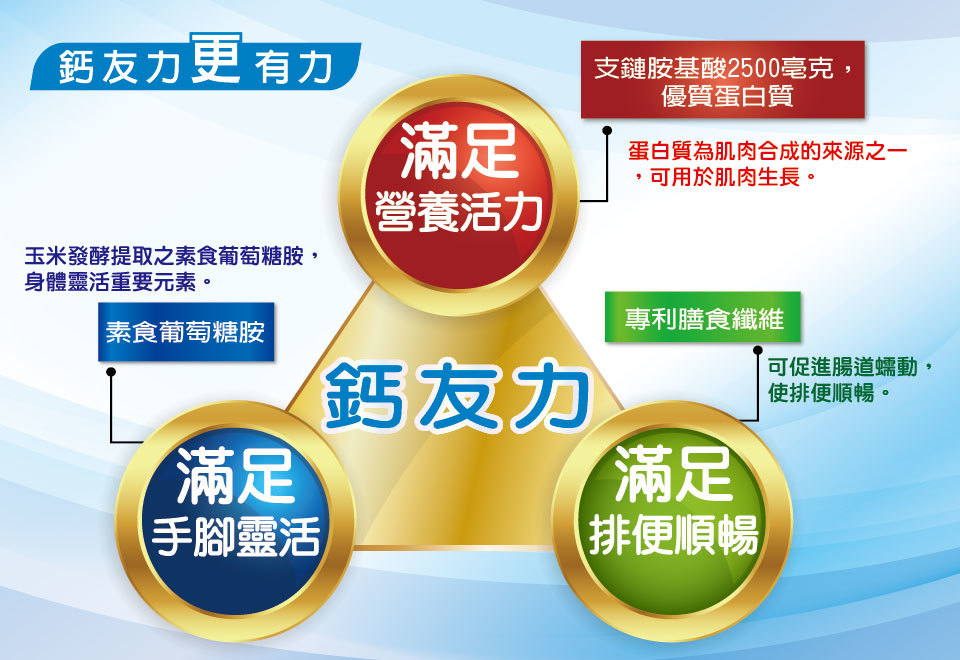 ● 滿足營養活力 手腳靈活 ● 素食葡萄糖胺/強化高鈣/雙專利 ● 支鏈胺基酸/高生理價優質蛋白
