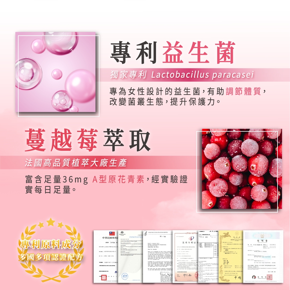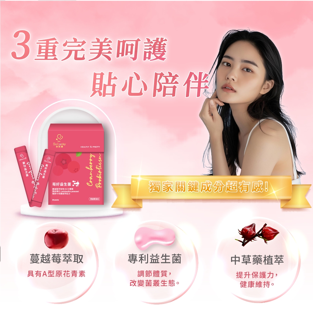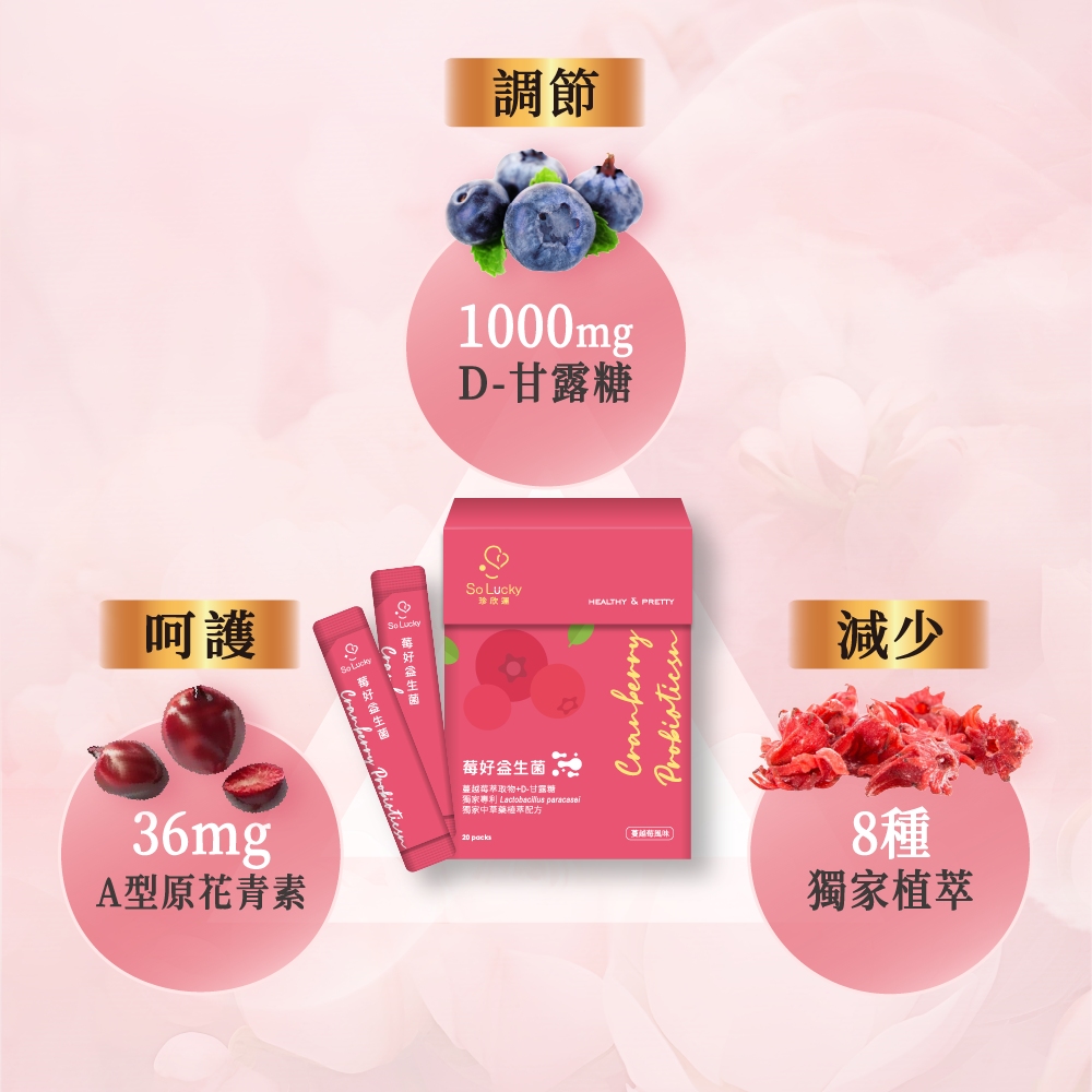 【珍欣運】莓好益生菌 20包/盒|專為女性打造的蔓越莓益生菌保養首選 ✨ 專利複方益生菌配方,輕盈生活從日常開始: 採用獨家專利菌株 Lactobacillus paracasei 搭配D-甘露糖與前花青素36mg,溫和調理、維持日常舒適 幫助維持理想菌叢環境,輕鬆維持每日好感狀態 嚴選複方,適合女性日常保養,從內而外感受輕盈舒適 🌱 全素配方,安心食用: 無動物性成分,純植物來源 懷孕或特殊體質者,建議諮詢專業醫師再行食用 產品規格: 每包2克,每盒20入 已投保產品責任險0506字第23AML0000492號