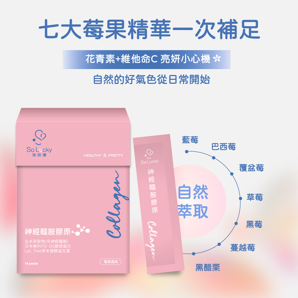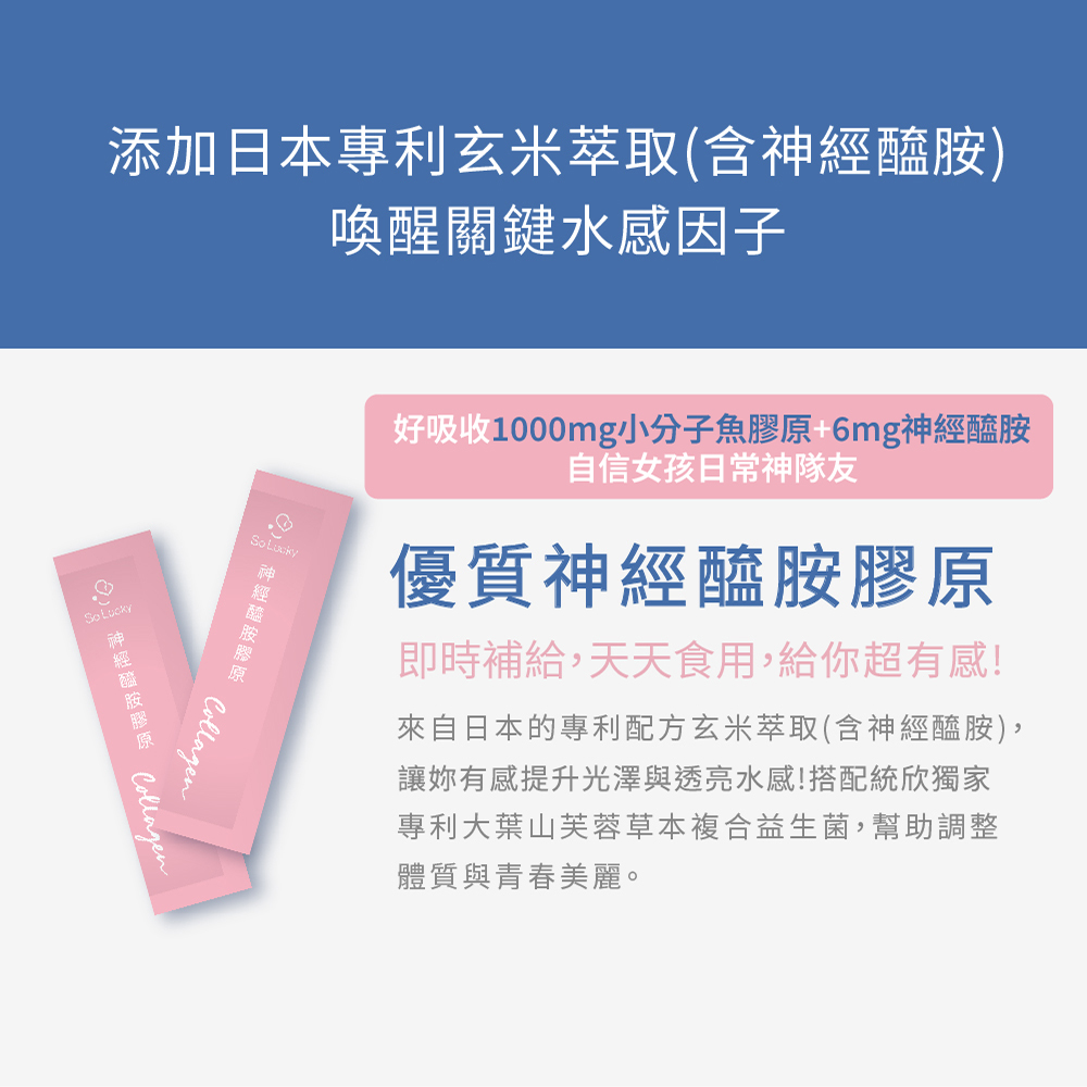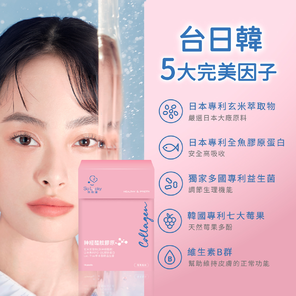 ▶ 透感水亮光澤的秘密:日本專利玄米萃取物(含神經醯胺),每包含有6mg,每日食用1包,連續食用4週可提升角質層含水量,讓你輕鬆擁有水感好氣色! ▶ 專為美麗設計的獨家專利益生菌:大葉山芙蓉草本複合益生菌,由漢方草本與益生菌結合,幫助調節體質,為美麗加分。 ▶ 日本專利PO·OG全魚膠原:由日本大廠專利雙胜肽PO·OG魚膠原,雙胜肽分子小好吸收。 ▶ 七種莓果多酚萃取:萃取天然莓果多酚,富含花青素與多種維生素,維持美妍好氣色。 ▶ 穀胱甘肽:隨著年齡增長,體內穀胱甘肽合成率下降,定期補充讓妳擁有美麗蘋果光。