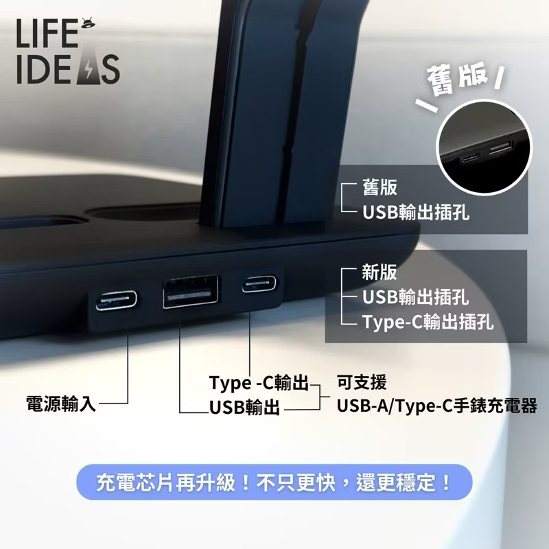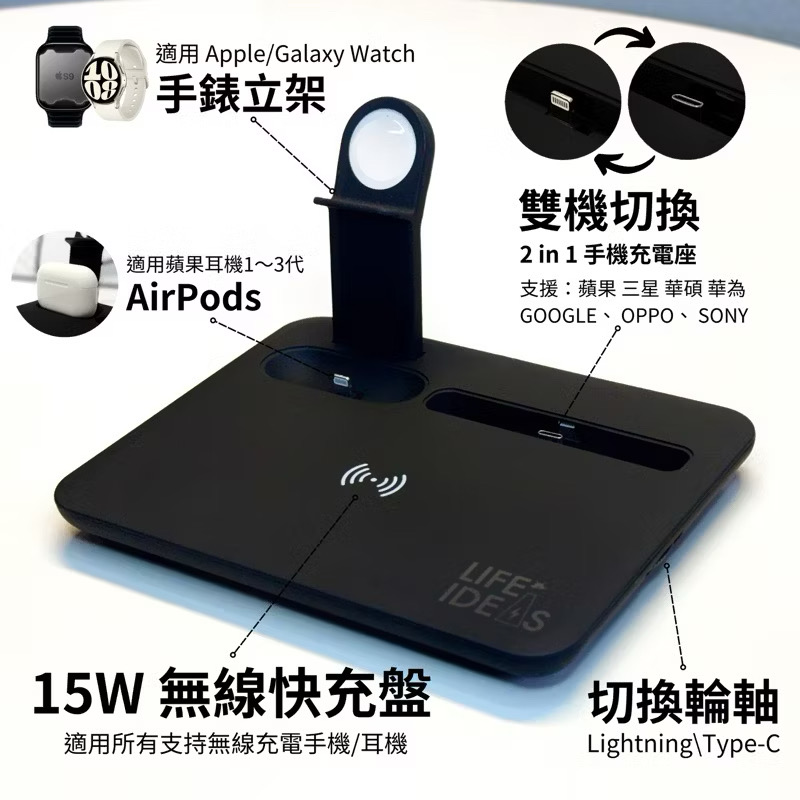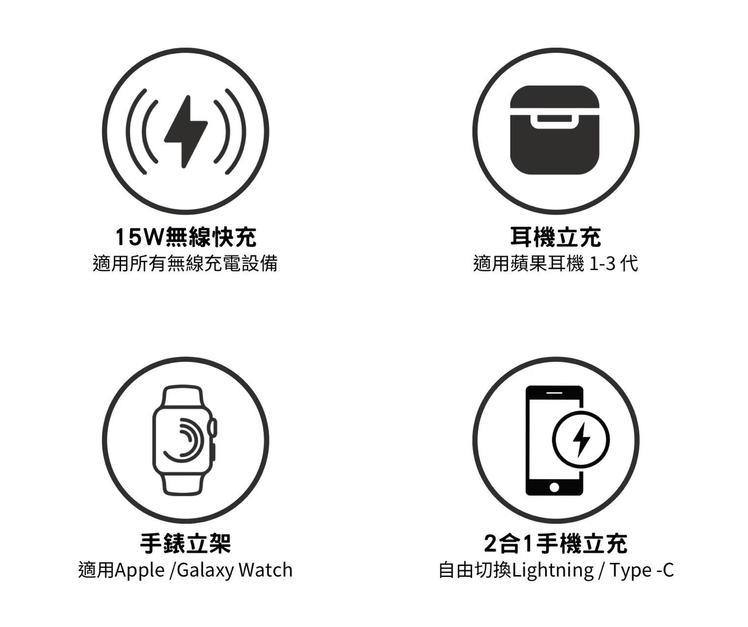 可同時充:座充手機x1 無線充手機x1 手錶x1 耳機x1