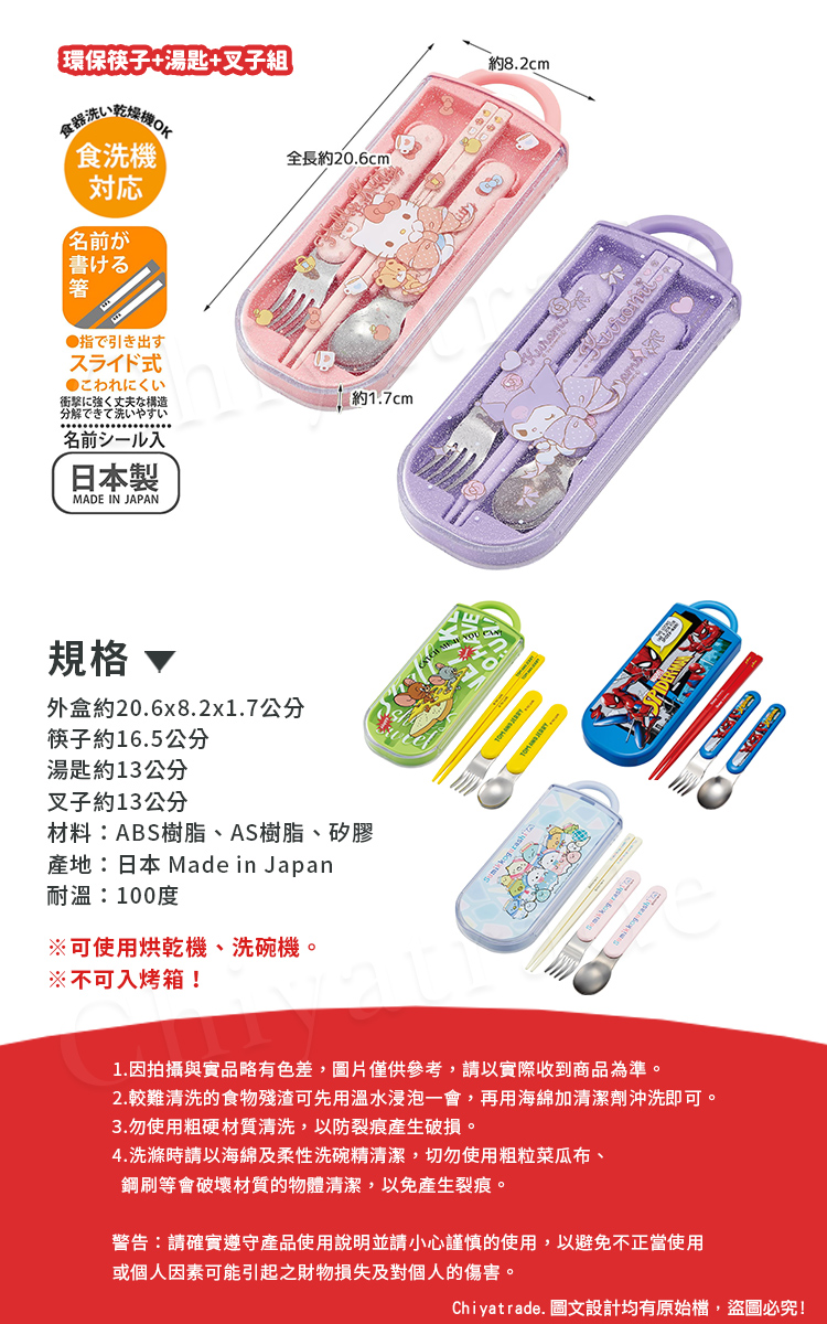 品牌:日本SKATER原廠公司貨-平行輸入外盒約20.6x8.2x1.7公分筷子約16.5公分湯匙約13公分叉子約13公分材料:ABS樹脂、AS樹脂、矽膠重量:約151g(含包裝)(手量誤差±5%)產地:日本 Made in Japan耐溫:100度