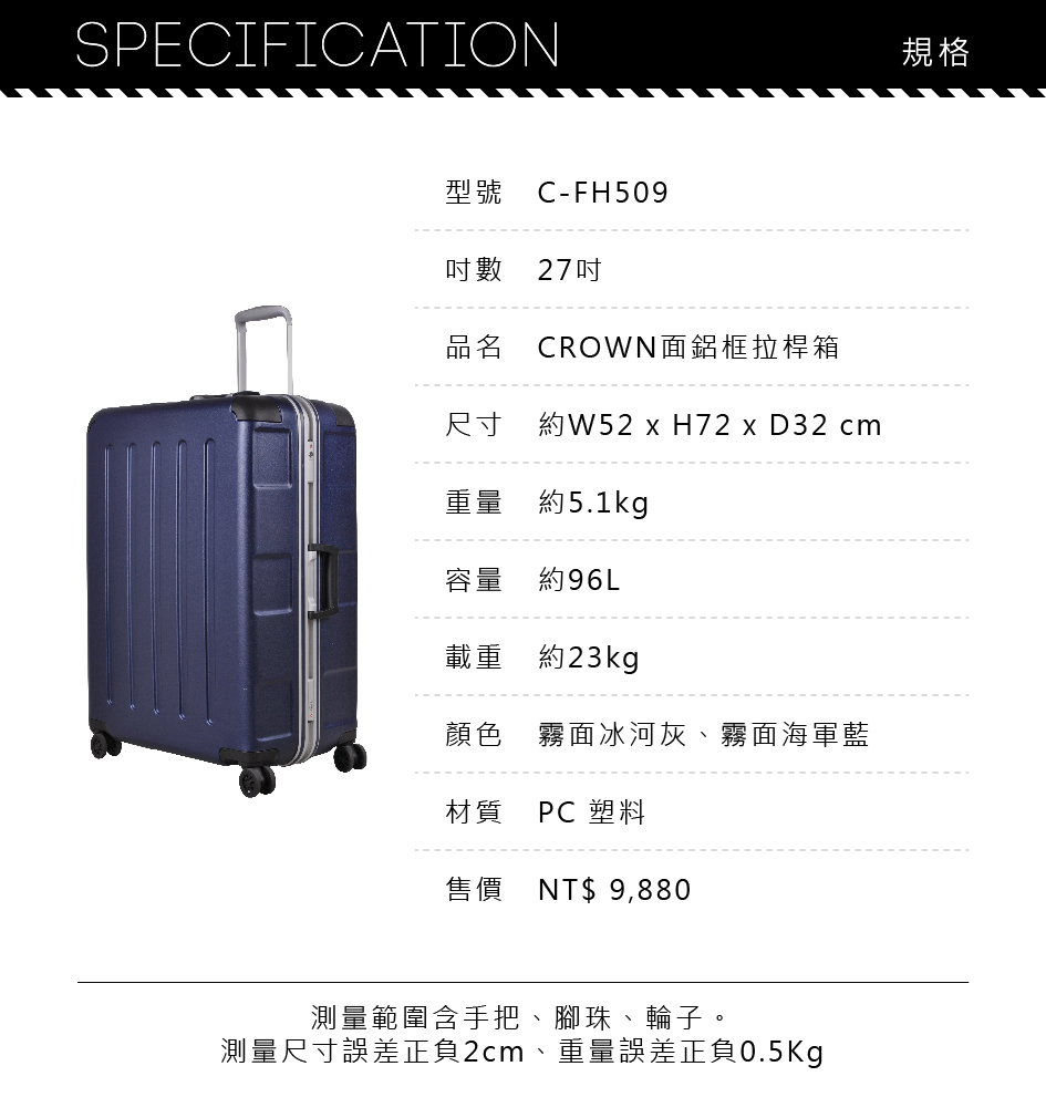 皇冠C-FH509 27吋霧面鋁框拉桿箱-海軍藍色