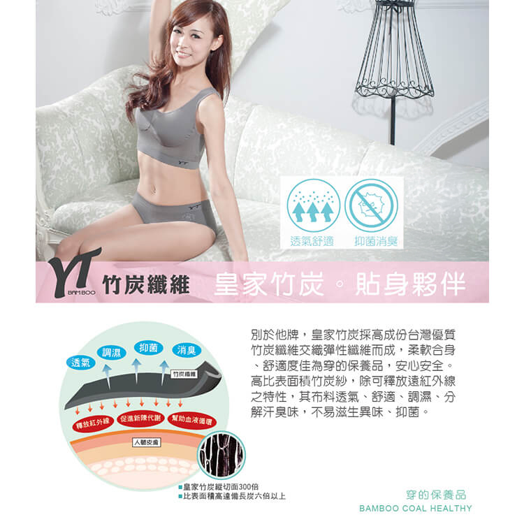 高成分優質竹炭纖維棉交織彈性纖維紗而成,舒適度佳,釋放遠紅外線,促進新陳代謝,為健康加分。