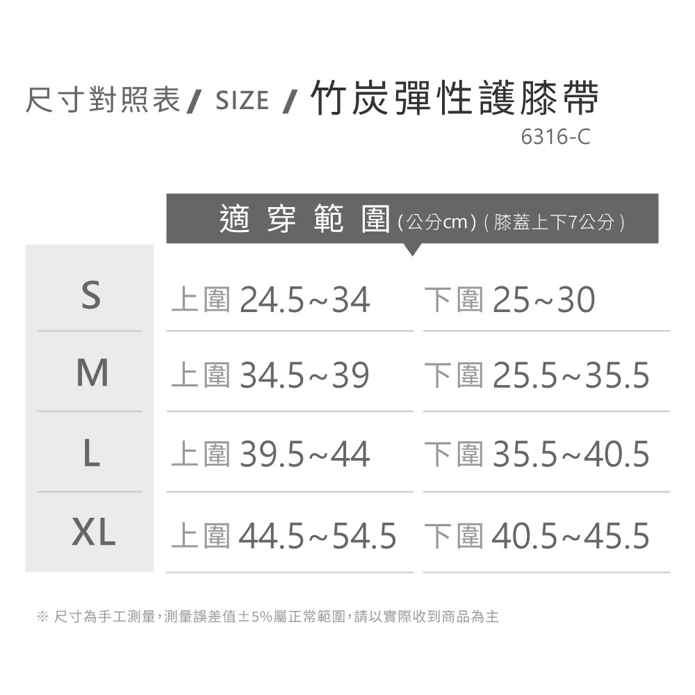●竹炭彈性纖維織成,透氣不悶熱。同時,於膝蓋骨處添加竹炭顆粒墊。給予膝部保護