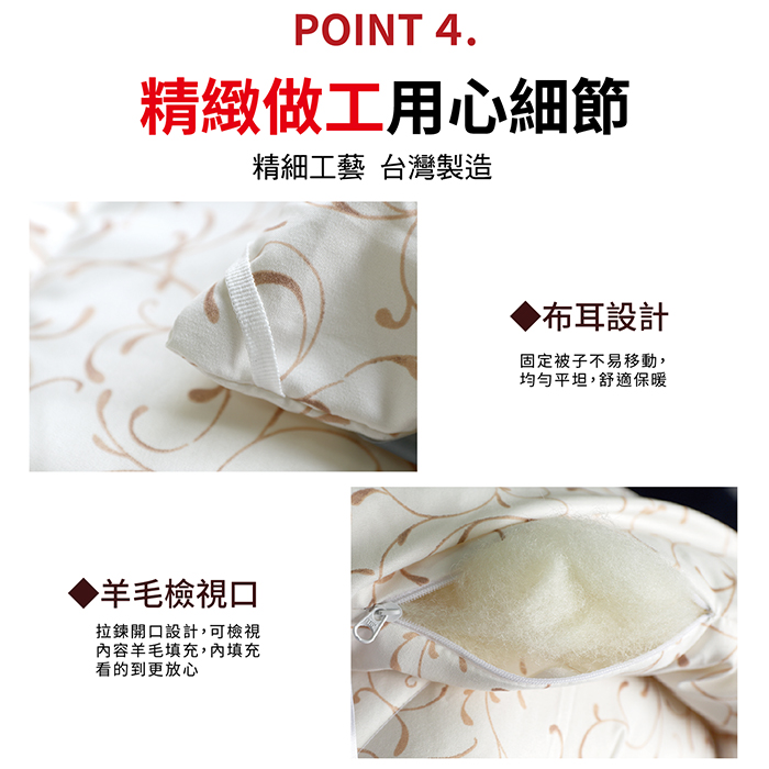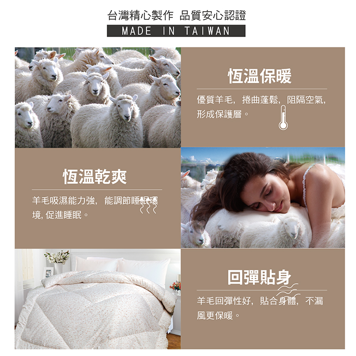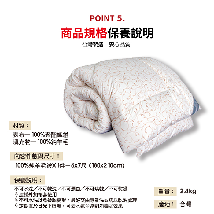 ★產地:台灣 ★內容件數與尺寸: 羊毛被X1件-6x7尺(180x210cm)不可水洗╱不可乾洗╱不可漂白╱不可烘乾╱不可熨燙§建議外加布套使用§不可水洗以免被胎變形,最好交由專業洗衣店以乾洗處理§定期置於日光下曝曬,可去水氣並達到消毒之效果