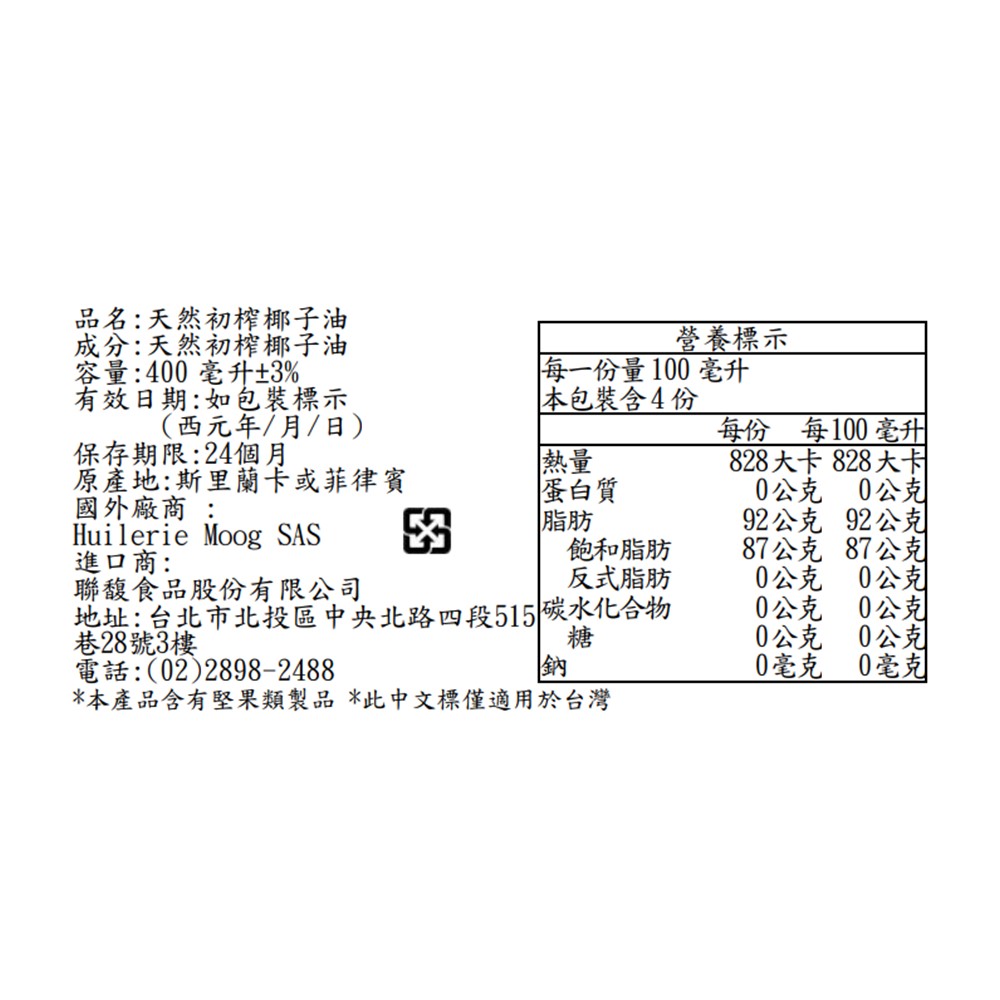 【聯馥】天然初榨椰子油400ML X2瓶/組