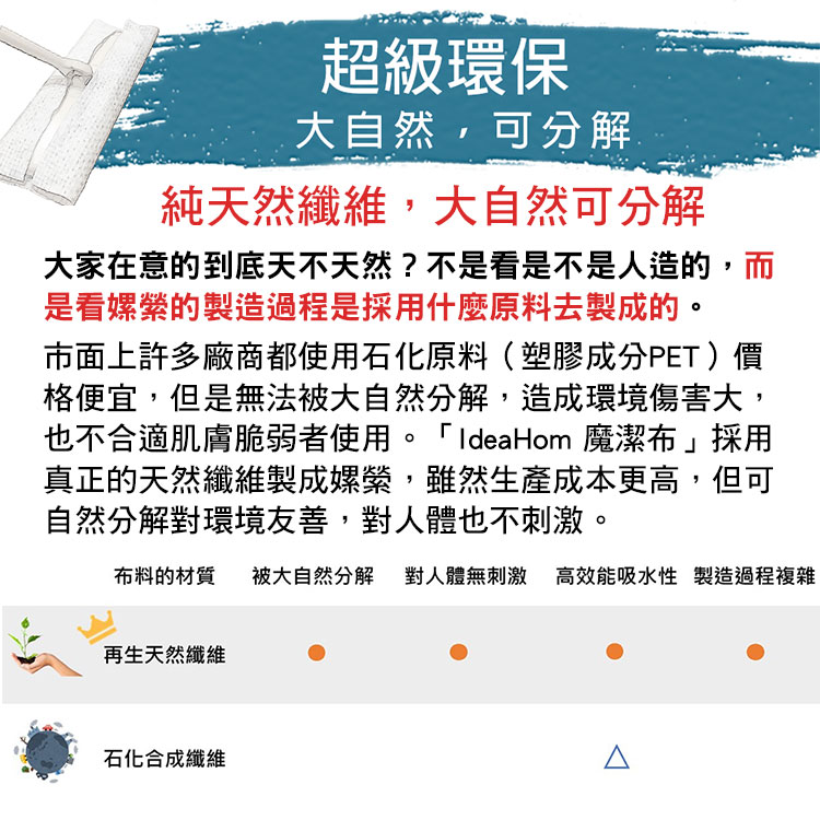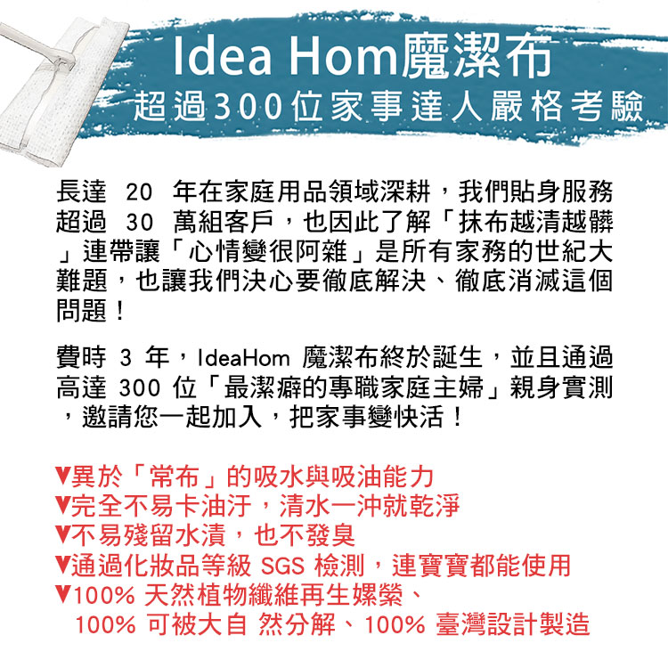 家裡的抹布您有想過這些嗎?✘ 不易乾,還會滴水✘ 全新抹布用一周,含菌竟高達 300 多億,比馬桶還髒!✘ 用一陣子就發硬,擦拭容易刮傷物品✘ 染油漬後就變黃發臭,怎麼洗都沒用✘ 高溫殺菌或是泡漂白水後,布上殘留一股怪味✘ 想要經常換抹布,卻好傷荷包,因為好一點的抹布也要 50-100 元✨✨商品特色✨✨👉異於「常布」的吸水與吸油能力👉完全不易卡油汙,清水一沖就乾淨👉易殘留水漬,也不發臭長達 20 年在家庭用品領域深耕,我們貼身服務超過 30 萬組客戶,也因此了解「抹布越清越髒」連帶讓「心情變很阿雜」是所有家務的世紀大難題,也讓我們決心要徹底解決、徹底消滅這個問題!費時 4 年,魔潔布終於誕生,並且通過高達 300 位「最潔癖的專職家庭主婦」親身實測,邀請您一起加入,把家事變快活!通過化妝品等級 SGS 檢測,連寶寶都能使用100% 天然植物纖維再生嫘縈、100% 可被大自然分解、100% 臺灣設計製造