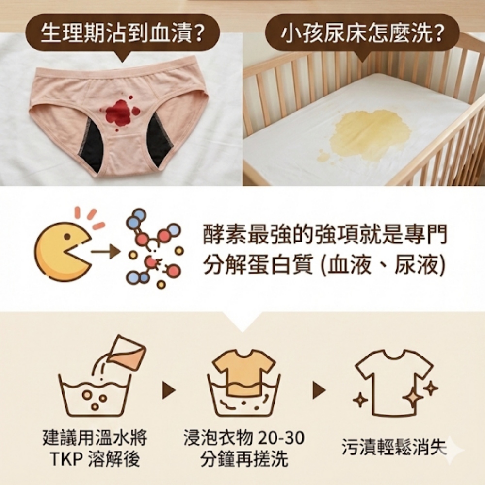 貼身衣物以小臉盆容量約10g酵素比例,若遇生理期建議以溫水浸泡約30分鐘後手洗清洗即可