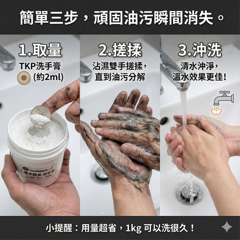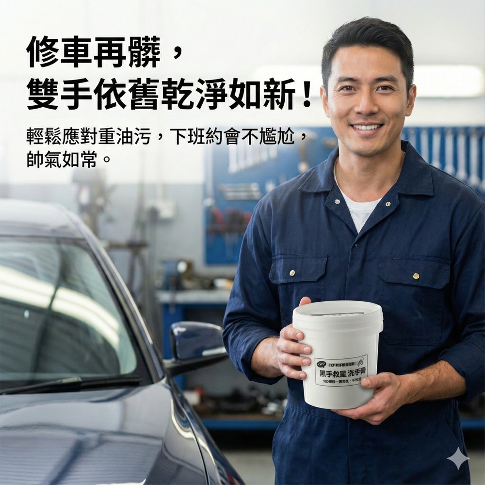每天和機油、污垢搏鬥的你,雙手卻總是被傷害?TKP知道,我們的黑手救星純天然洗手膏,專為車輛維修員設計~強效去污,卻溫和不傷手不咬手、不乾裂,讓你的皮膚時刻健康只需輕輕搓揉,頑固油污瞬間消失,雙手潔淨無比修車再髒,雙手依舊乾淨如新純天然成分,強效潔淨力,讓你輕鬆應對工作,帥氣如常黑手救星洗手膏,就是這麼可靠