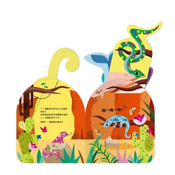 ★聽覺+觸覺+視覺三重驚喜,刺激五感統合★★動動小手,拉一拉,聆聽5種動物的有趣叫聲吧!★ 動物點點名要開始了! 大家準備好了嗎? 被點到的記得要翹起尾巴喔! 咦?怎麼有動物抬起頭? 拉拉動物形狀的紙板, 聽見5種有趣的叫聲吧!本書特色 【5種動物的叫聲,刺激聽覺發展】 在【動物點點名】系列中,每一個跨頁都有拉動的音效機關,當孩子拉動尾巴機關的時候,就可以立即聽到動物的叫聲,透過高音質的呈現,讓孩子迅速地感知聲音的變化,並認識各種動物的聲音特徵。 有哪些動物呢? 猴子 蛇 海豚 孔雀 青蛙 【拉動形狀紙板,促進觸覺發展】 書中紙板會根據動物的尾巴輪廓而設計形狀,例如海豚的尾巴紙板有一對鰭,讓孩子動手觸摸書。另外,滑動機關的動作可以訓練孩子的手部肌肉,藉以訓練孩子的觸覺發展。 【淺顯易懂的文字,養成閱讀好習慣】 書中的文字簡單有趣,透過多次重疊的狀聲詞,讓孩子不僅輕鬆掌握動物的聲音,還能閱讀輕鬆的小故事,養成閱讀好習慣,強化語文能力。 【插圖色彩鮮豔,刺激視覺發展】 本系列的插圖使用鮮豔的藍、黃、綠等彩度較高的色彩,刺激嬰幼兒的視覺,插畫家描繪的動物和場景簡單可愛,吸引孩子的注意力,讓大人小孩都愛不釋手!美麗的圖畫不僅能輔助視覺的刺激和學習,更讓孩子從小接受美好事物的薰陶,培養美感素養。 【高音質播放器,創造高品質的有聲書】 清晰悠揚的聲音,讓人彷彿置身在動物園裡,聆聽由動物的叫聲譜成的美妙樂曲。此外,本書的音量適中,既不會大到損害孩子的耳朵,也不會小聲到聽不清楚,恰到好處的音量,打造完美的聲音品質! 【高質感設計】 厚紙板手工書,不容易撕破,1歲以上寶寶都可以使用。圓角設計,防止寶寶被紙割傷或被邊角刺傷,非常安全。 詳細資料ISBN:9786267314241叢書系列:動物點點名規格:精裝 / 10頁 / 15 x 27 x 2.5 cm / 普通級 / 全彩印刷 / 初版出版地:台灣