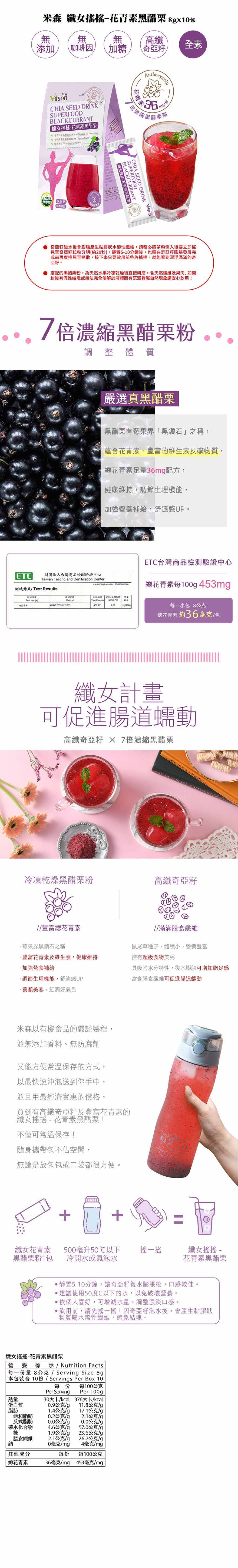 【商品特色】奇亞籽富含膳食纖維,可促進腸道蠕動7倍濃縮黑醋栗,每份總花青素含36mg,加強營養補給無咖啡因X無加糖無添加香料及防腐劑銷售重點【高纖奇亞籽 X 黑醋栗】米森選用高纖奇亞籽,營養豐富的超級食物,具有吸附水分的特性,腹水膨脹後可直接食用,增加飽足感,具富含膳食纖維,可促進腸道蠕動,再搭配7倍濃縮黑醋栗粉,堅持無添加,每份36mg配方,提供滿滿花青素,加強營養補給及健康維持,一天一杯調節生理機能,舒適感UP。