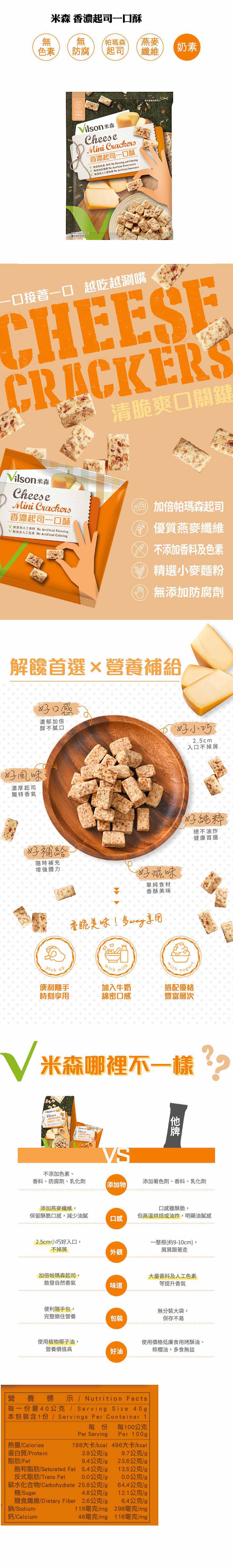『米森』與台灣本土餅乾大廠合作,以香濃帕馬森起司為基底,經過多次配方調整,並以專業烘焙技術完美結合香濃起司與燕麥纖維,全程無添加人工香料與色素,打造出口感與營養兼具的香濃起司一口酥,搭配便利隨手包,每一口都是濃郁起司香x酥脆綿密的雙重享受!