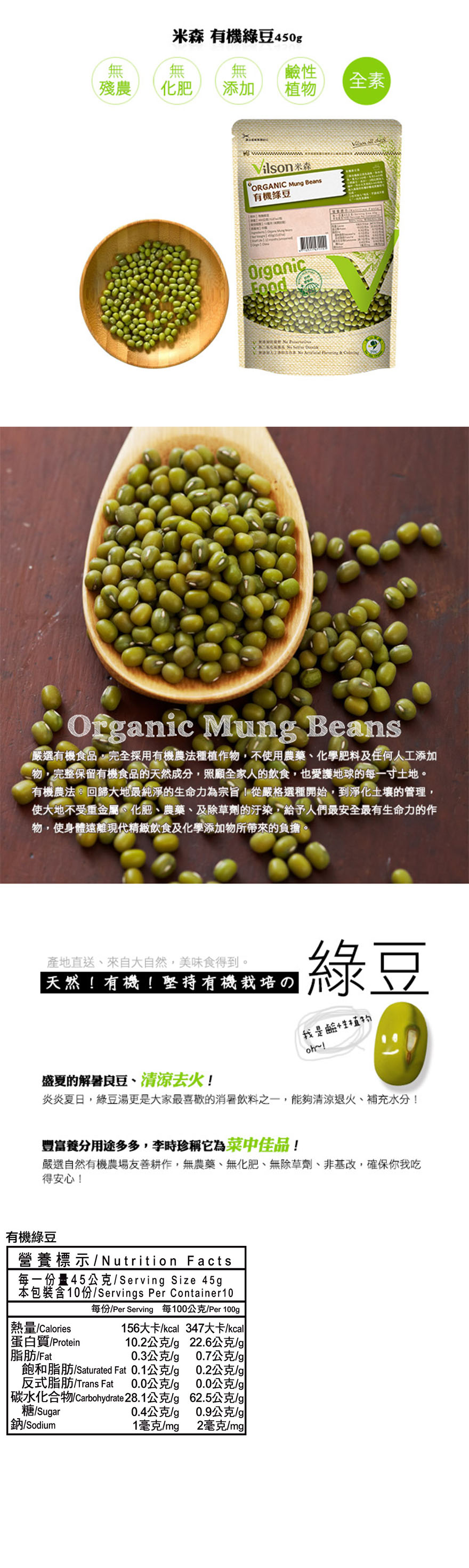 ★商品特色有機級無添加防腐劑、人工香料及色素保證不使用農藥、化學肥料及人工添加物完全採用有機農法種植作物★銷售重點嚴選有機食品,完全採用有機農法種植作物,不使用農藥、化學肥料及任何人工添加物,完整保留有機食品的天然成份,照顧全家人的身體,也愛護地球的每一寸土地。綠豆含有植物性蛋白質,其含有的天然成份,能幫助消化,使排便順利,維持正常飲食的功能,參與能量的代謝,且還能維持骨骼和牙齒正常發育,是身體補給的來源之一。