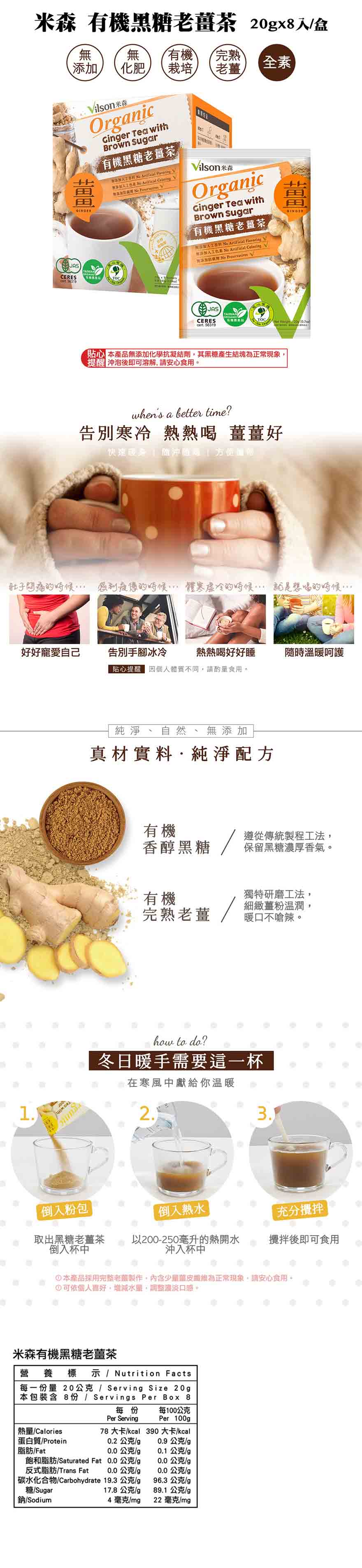 【商品特色】★ 有機級無添加防腐劑、人工香料及色素完熟老薑、暖口不嗆辣經SGS檢驗不含農藥無添加化學抗凝結劑,故黑糖結塊屬正常現象,請安心食用銷售重點【完熟老薑~暖口不嗆辣】特別採用完熟老薑調配特濃黑糖, 完美呈現老薑的暖口不嗆辣及濃郁黑糖風味, 為最佳冬季溫暖飲品,適合全家安心食用。※本產品無添加化學抗凝結劑,其黑糖產生結塊為正常現象,沖泡後即可溶解, 請安心食用。