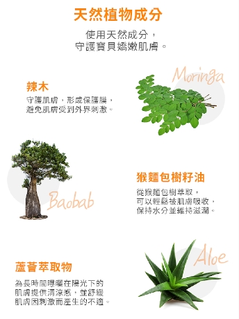 本品含有從辣木、猴麵包樹和蘆薈等植物中提取的純植物性植物保護液(Botanical Protection