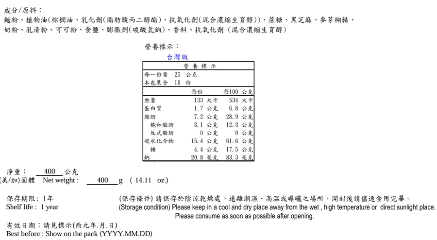 ◎品牌:義美 ◎規格: 400g克 x 1 x 1Bag袋