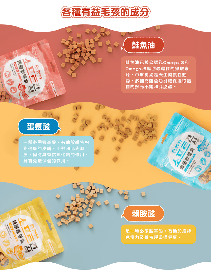 韓國明太魚丁 明太魚含有豐富的氨基酸 幫助維持肌肉毛髮健康 嚴選自韓國海域的明太魚,富含葡萄糖胺,能幫助毛孩維持關節健 康。低熱量、高蛋白,是理想的營養補充零食,適合日常餵食或訓練 時的獎勵,給您的毛孩健康美味的享受!