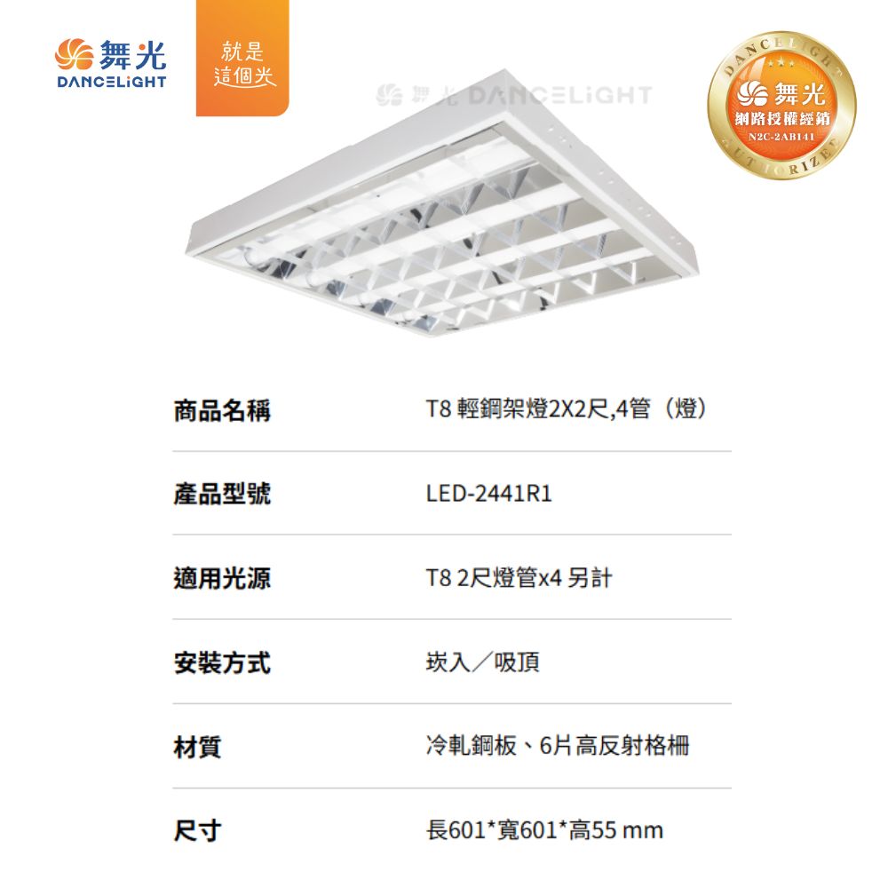 商品名稱:舞光T8輕鋼架燈2尺*2尺 4管