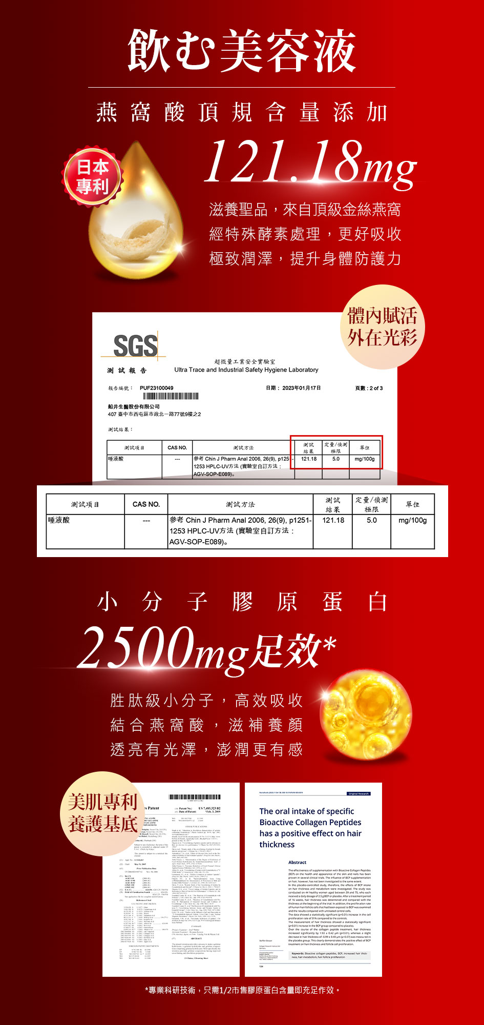 ★2023頂標含量添加-燕窩酸121.18mg ★日本專利金絲燕窩:外養顏,內滋補 ★日本專利頂級玻尿酸:潤澤保養,散發年輕自信