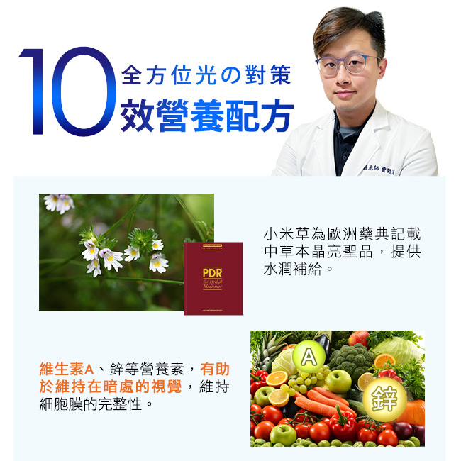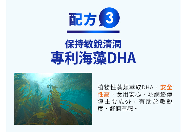 小米草萃取、葉黃素20%(金盞花萃取)、金盞花萃取(含專利zeaone玉米黃素藍光專利:US9226940)、葡萄糖酸鋅、美國專利藻類萃取(含DHA)、葡萄糖酸銅、專利磷脂質絲胺酸(PS)、硬脂酸鎂、二氧化矽、雨生紅球藻(含蝦紅素)、維生素A 膠囊成份:羥丙基甲基纖維素、純水、鹿角菜膠、二氧化鈦、食用紅色七號、氯化鉀、食用黃色四號、食用藍色一號