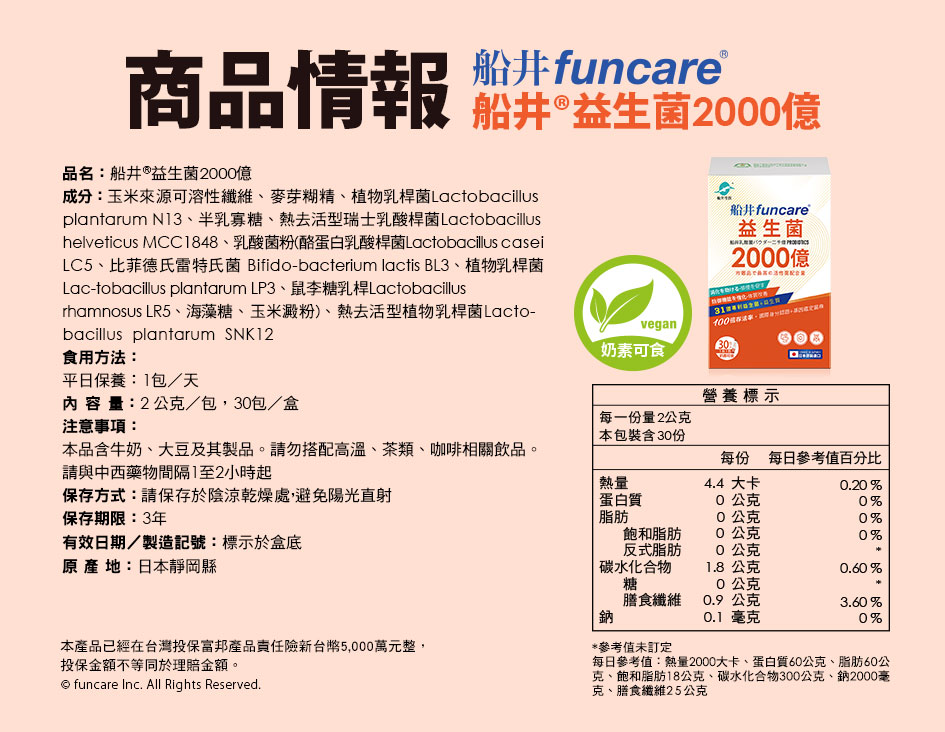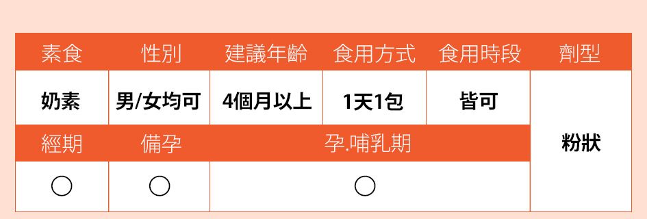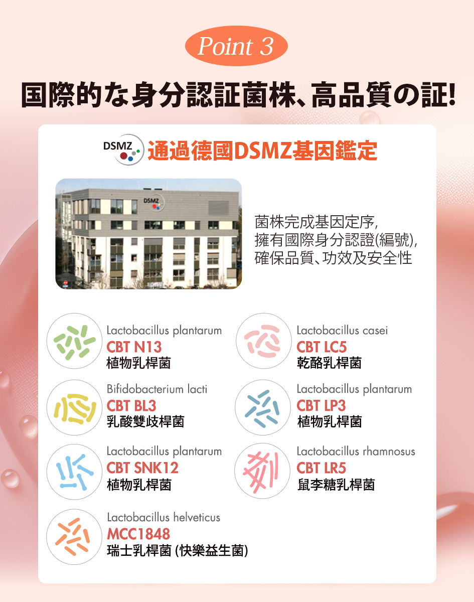 玉米來源可溶性纖維、麥芽糊精、植物乳桿菌Lactobacillus plantarum N13、半乳寡糖、熱去活型瑞士乳酸桿菌Lactobacillus helveticus MCC1848、乳酸菌粉(酪蛋白乳酸桿菌Lactobacillus casei LC5、比菲德氏雷特氏菌 Bifido-bacterium lactis BL3、植物乳桿菌Lac-tobacillus plantarum LP3、鼠李糖乳桿Lactobacillus rhamnosus LR5、海藻糖、玉米澱粉)、熱去活型植物乳桿菌Lacto