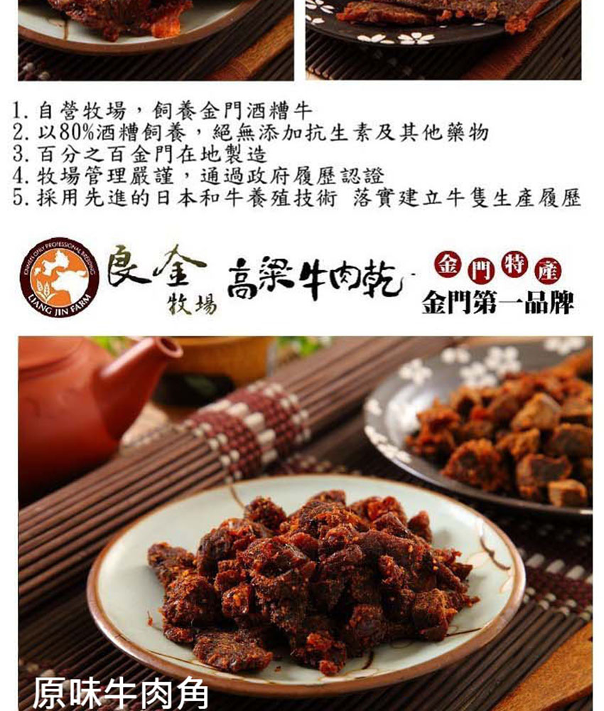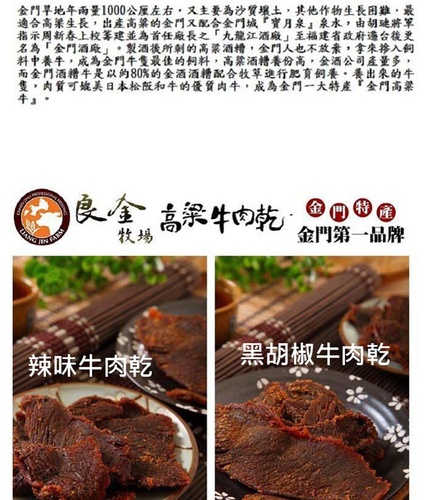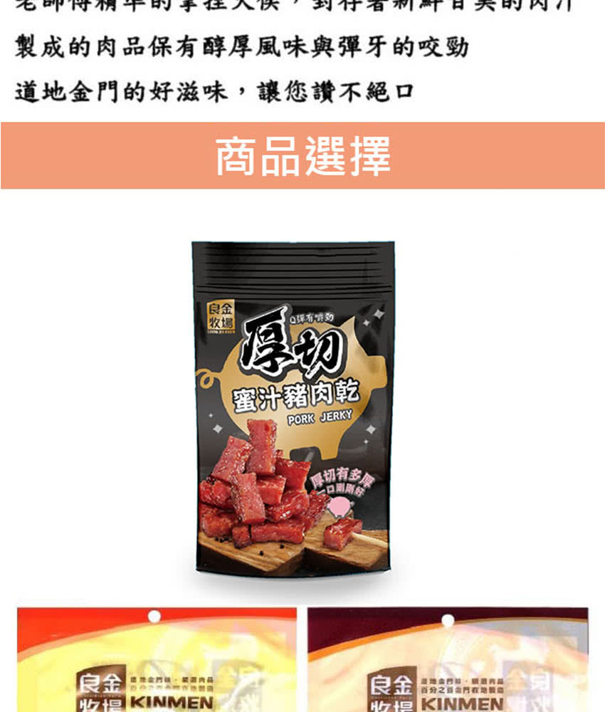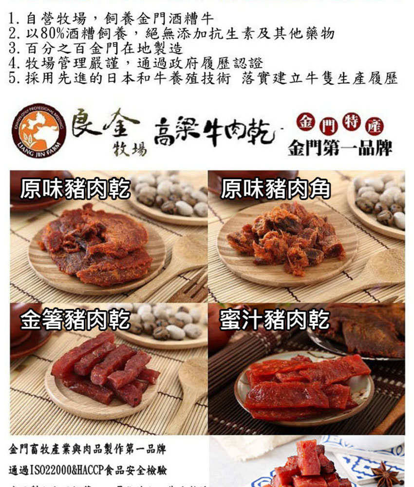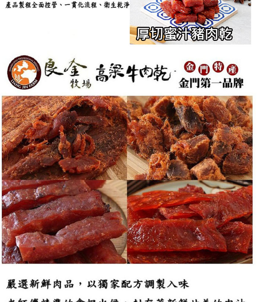 高粱豬肉乾(金箸):精選豬肉、糖、醬油、鹽、高梁酒、肉桂、甘草