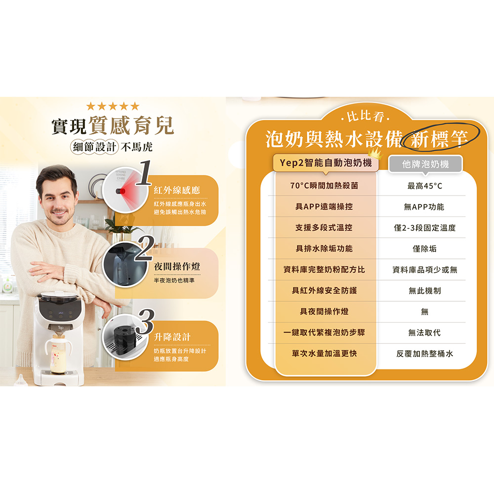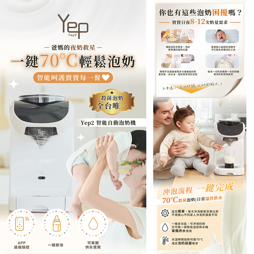 Yep2智能自動泡奶機是一款結合APP操作,可以一鍵控制機器自動泡奶的電器用品,且操作過程只需要一個指令,即可滿足所有泡奶流程,包含熱水控溫、奶粉控量、粉水融合等等步驟,無泡奶需求時也可當作一般智能溫控熱水機使用。避免寶寶在高頻率哭鬧要奶時,繁瑣的傳統泡奶程序讓每位爸爸媽媽焦頭爛額,一機不但輕鬆滿足寶寶一天10-12次的奶量需求,也可以幫助爸爸媽媽極簡化過多的泡奶流程。
