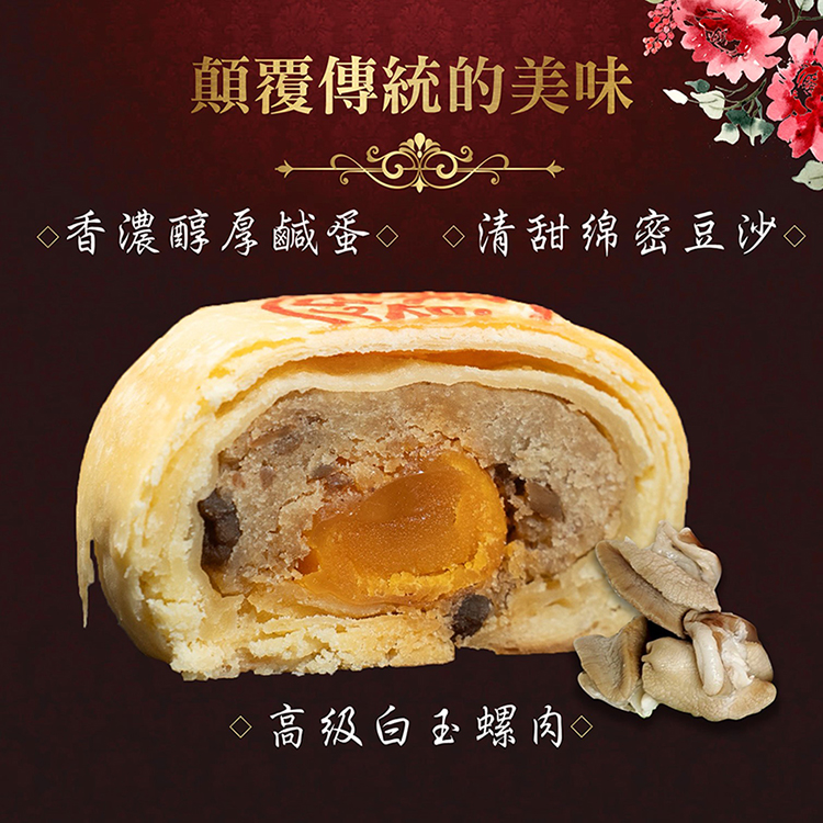 麵粉、奶油、無水奶油、酥油、綠豆沙、豬肉、白玉螺肉、蛋黃