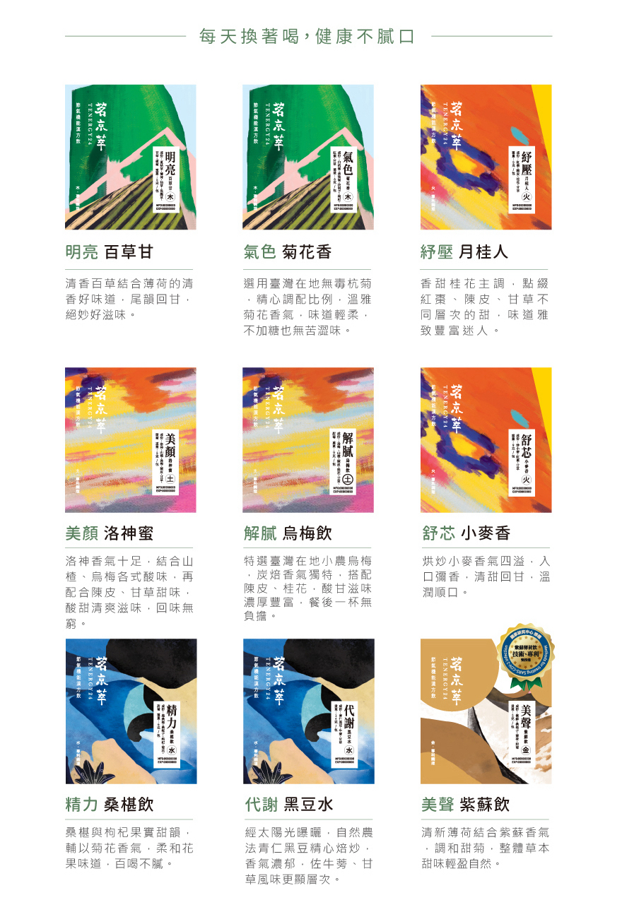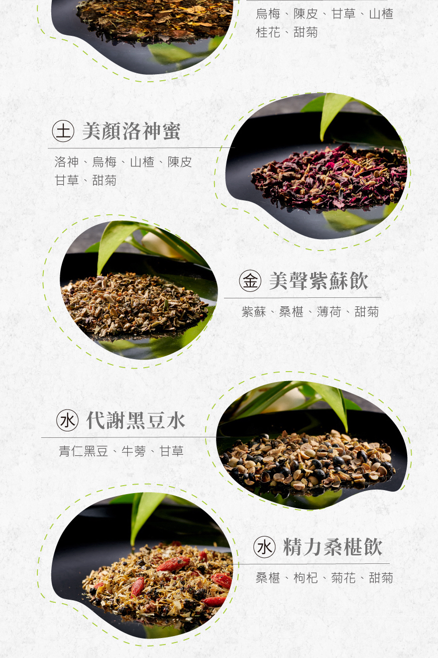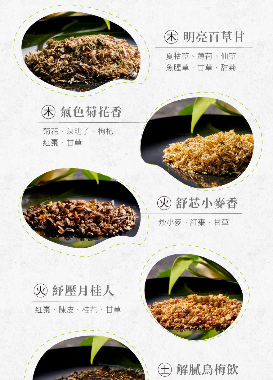 【火】舒芯小麥香9g x 2入、【火】紓壓月桂人5g x 2入【土】美顏洛神蜜5g x 2入、【土】解膩烏梅飲9g x 2入【金】美聲紫蘇飲5g x 4入