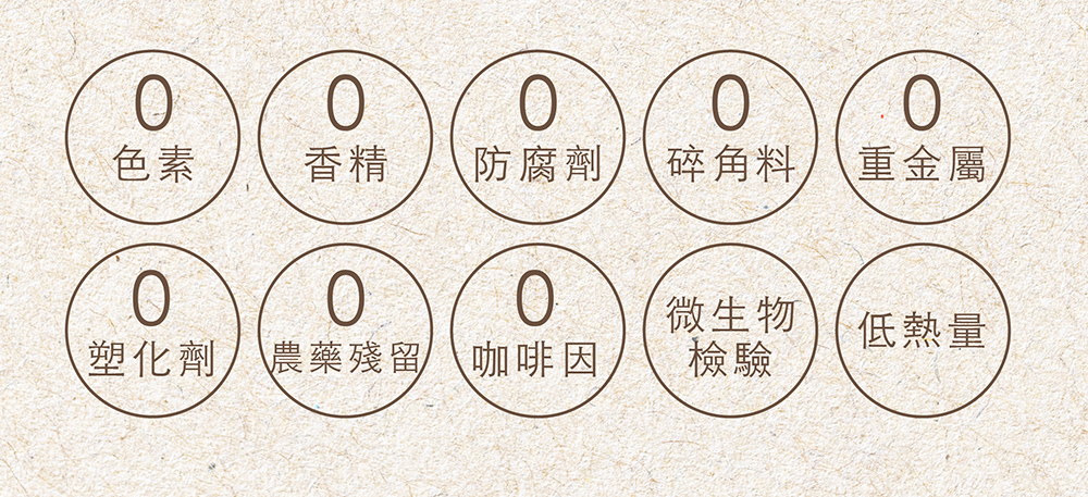 無色素、無香精、無防腐劑、無塑化劑、無重金屬、無咖啡因、無農藥殘留,不添加糖份,不使用碎角料,還有微生物安全檢驗把關,低熱量零負擔好安心!